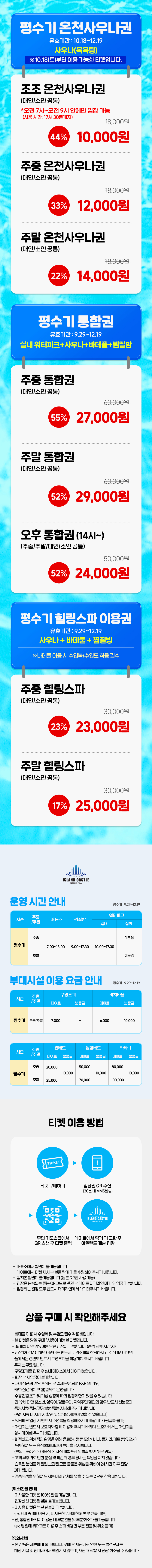 - 온천사우나 권종 티켓은 10/18(토)부터 이용 가능합니다. (유효기간 : 10/18~12/19)