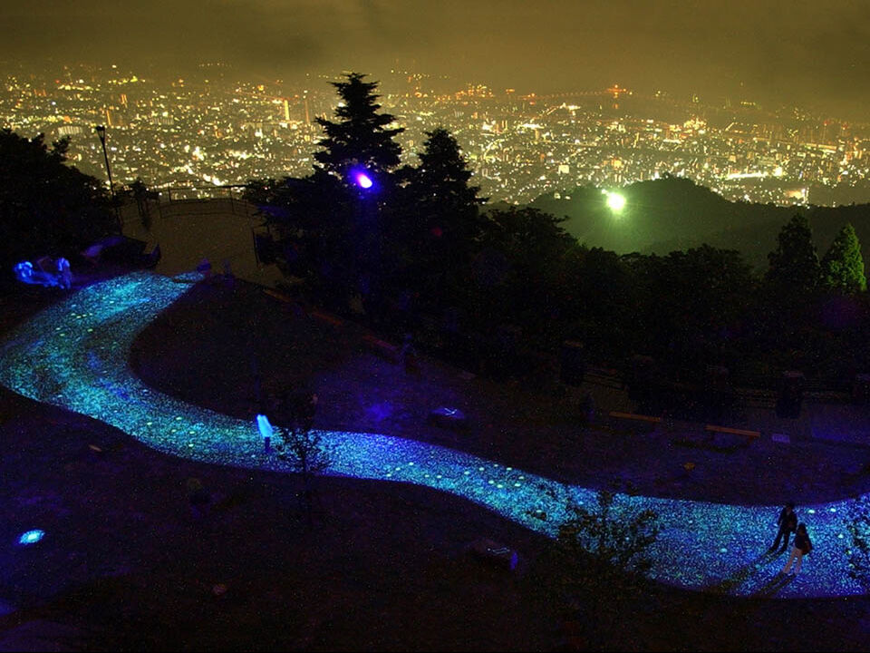 약 40m의 산책길인 “마야★반짝반짝 소경”에는 은하수를 모티브로 한 별자리 형광 조형이 설치되어, 푸른 빛으로 비추어진 환상적인 분위기를 연출합니다.