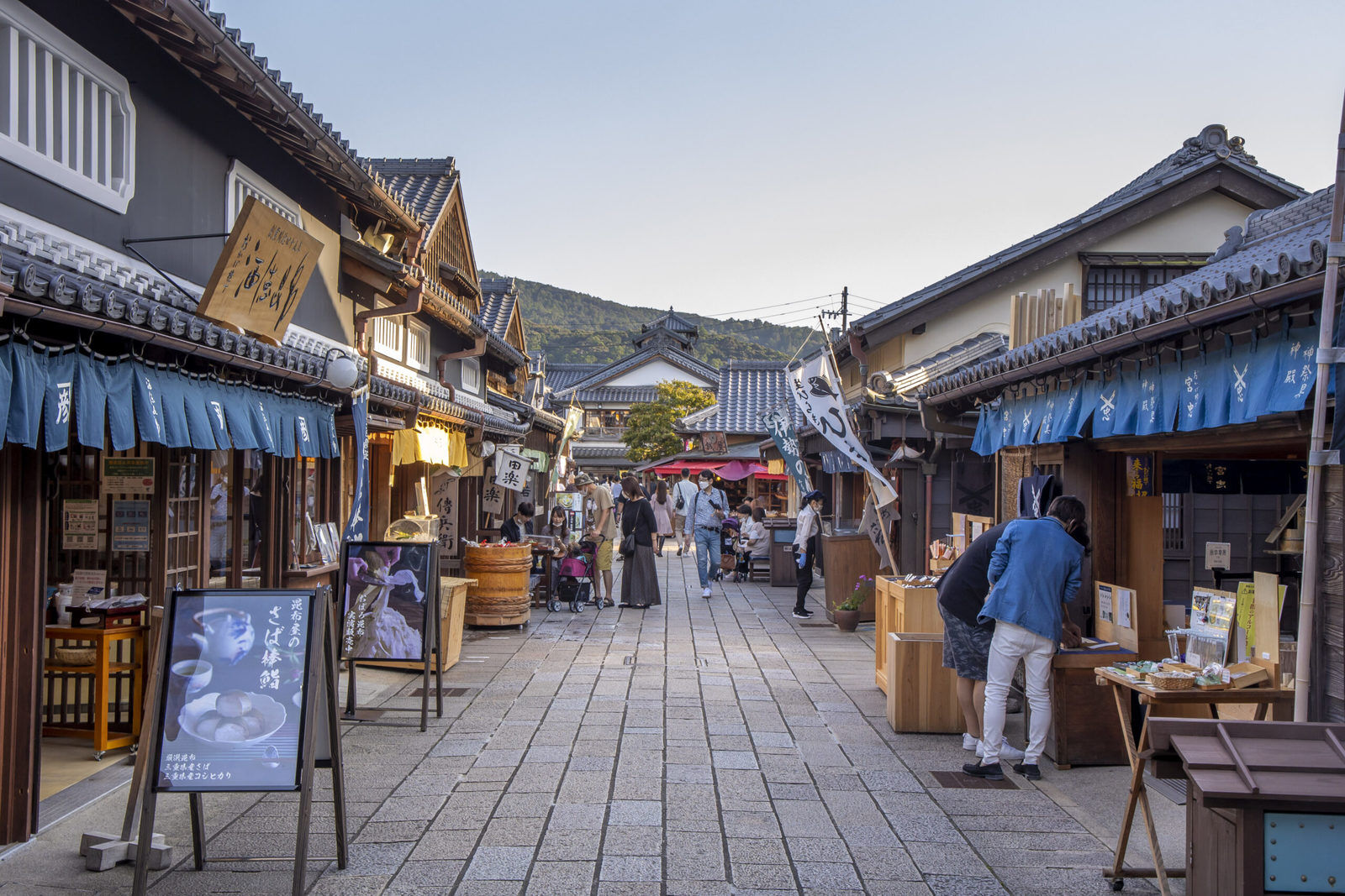 에도~메이지 건축 재현 거리에서 이세 특산/향토 요리를 즐길 수 있습니다. 대표 먹거리: 아카후쿠·이세우동·테코네스시·요코초만쥬 등 / 주말·공휴일 신은타이코 타이코 공연 진행. 입장료: 무료