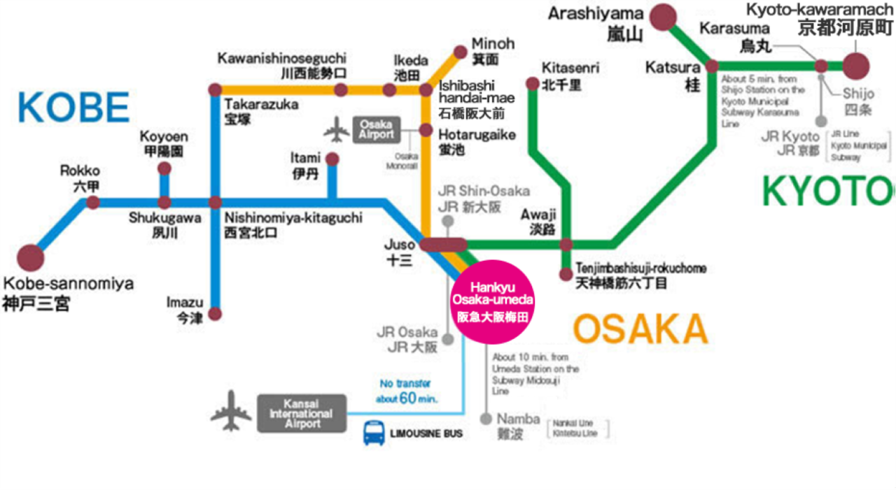 오사카, 교토, 고베, 타카라즈카 지역 여행을 계획하신다면, 한큐 원데이 패스로 오사카, 교토, 고베는 물론 타카라즈카 한큐 전철 라인을 이용하실 수 있습니다.(※ 고베 고속선 제외 ※)