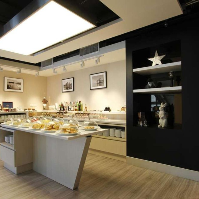 일반 비즈니스 클래스 고객과 같은 공간을 이용하며 뷔페 음식(샐러드, 샌드위치, 빵, 과일 등)이 제공됩니다.