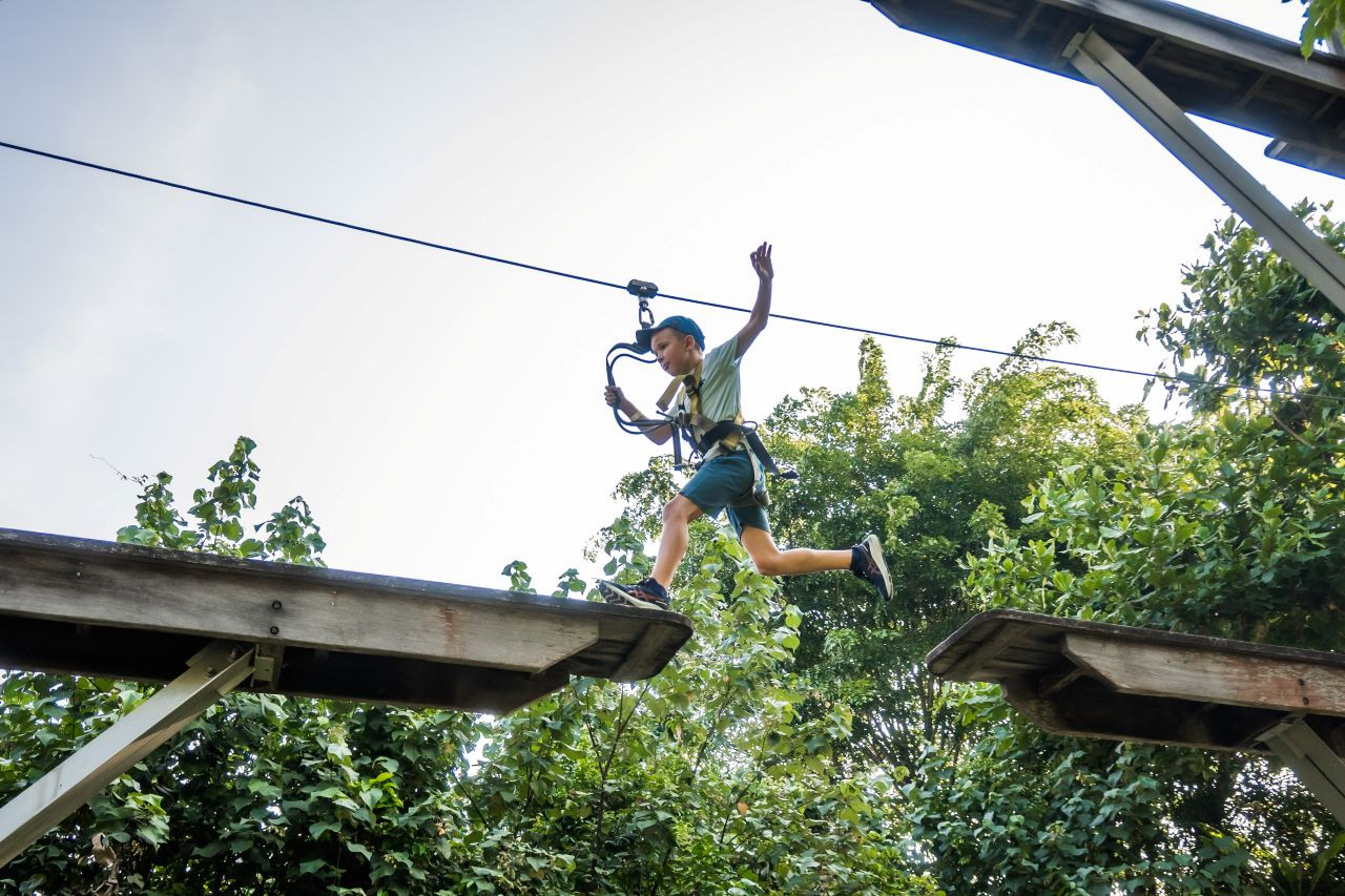 메가짚을 타고 시속 60km 속도로 정글과 해변 위를 가로질러 보세요.
