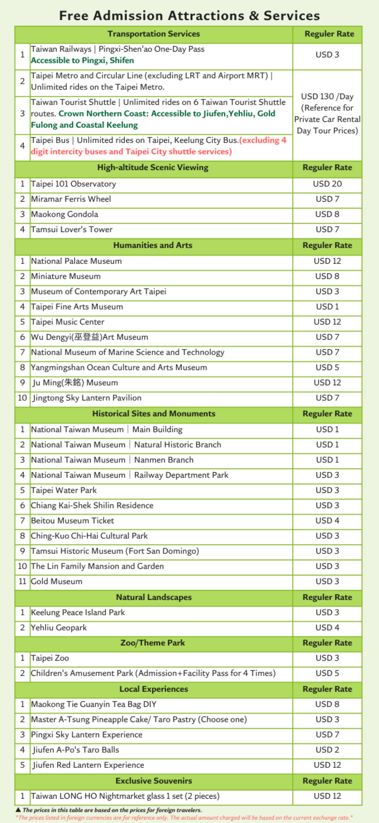 - 아래에 나열된 다섯 개의 대만 관광 셔틀 노선을 무제한 이용 가능하며, 양밍산, 예류, 핑시, 지우펀 등 주요 관광지에 접근 가능: