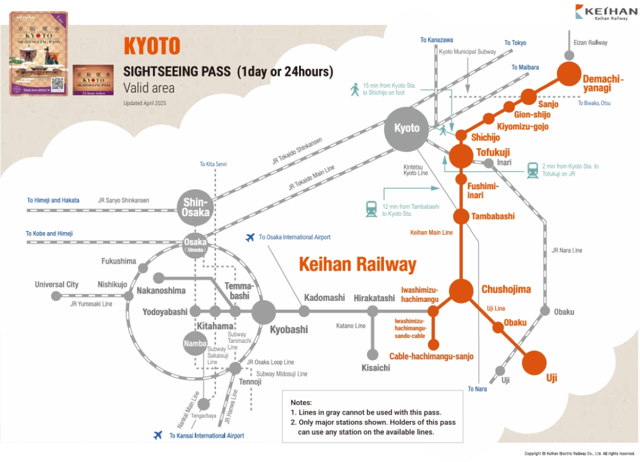 - 교환 장소, 적용 차량, 트램 노선 및 할인 등의 가이드 라인등의 내용은 다음 링크에서 확인 가능합니다 : (링크 : https://www.keihan.co.jp/travel/kr/trains/passes-for-visitors-to-japan/kyoto-osaka.html)