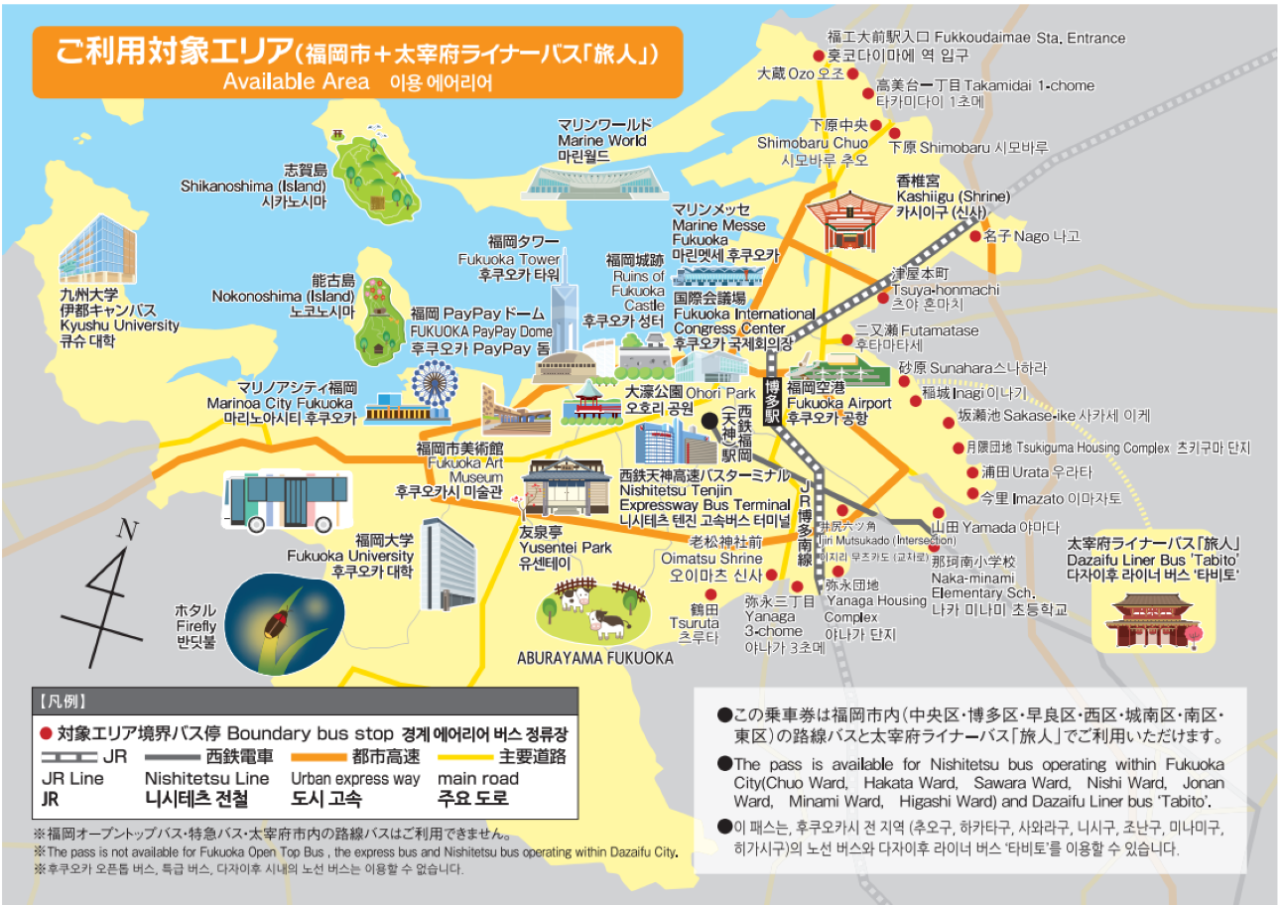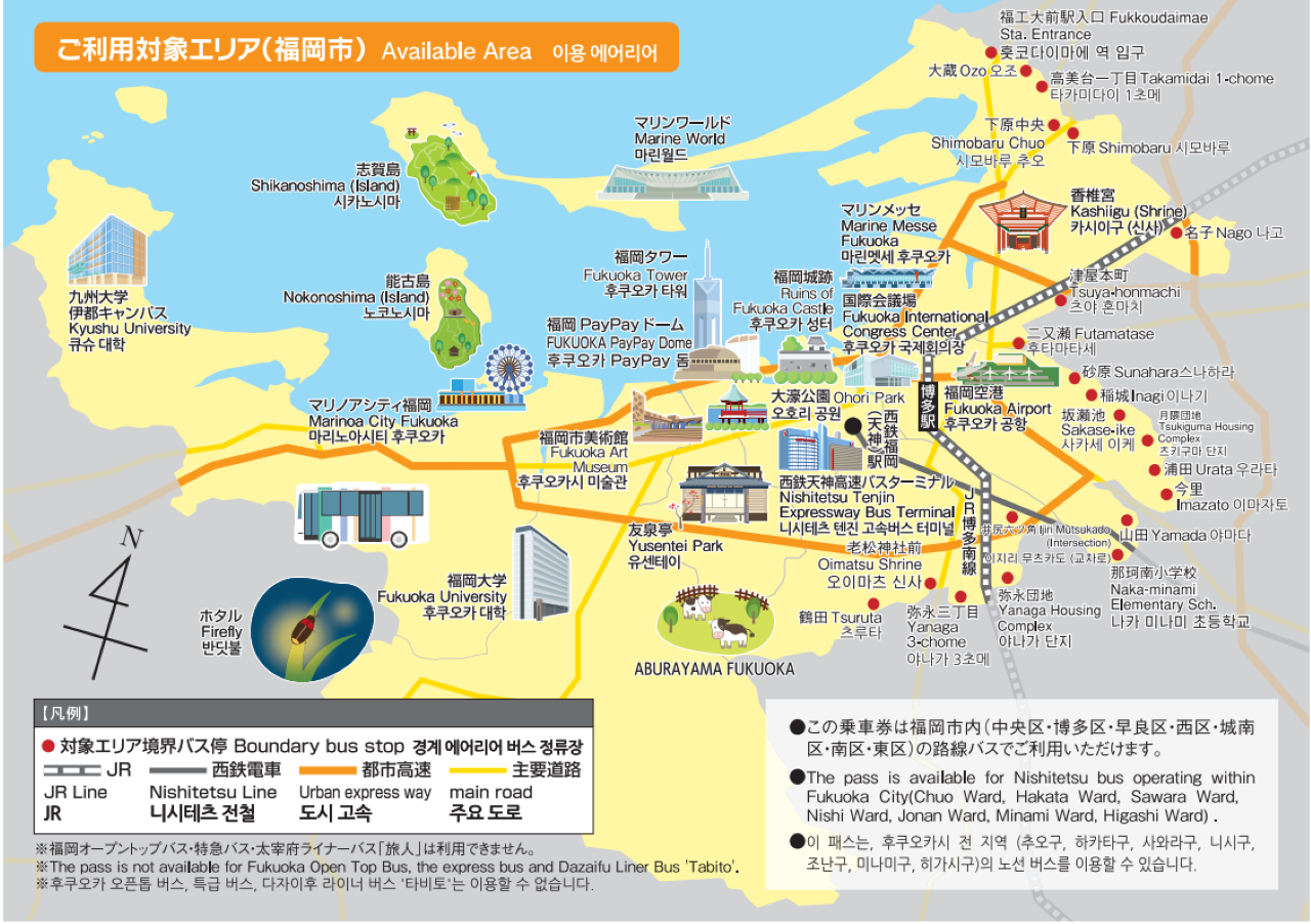 하카타만을 따라 선 후쿠오카는 일본에서 6번째로 큰 도시로 과거 역사와 현대의 미가 조화된 아름다운 도시입니다. 후쿠오카 시티 버스 1일 패스로 다양한 노선과 정류장에 무제한으로 탑승하여 후쿠오카 해변, 고대 사원, 쇼핑몰 등 가고 싶은 장소에 나만의 일정대로 이동해보세요.