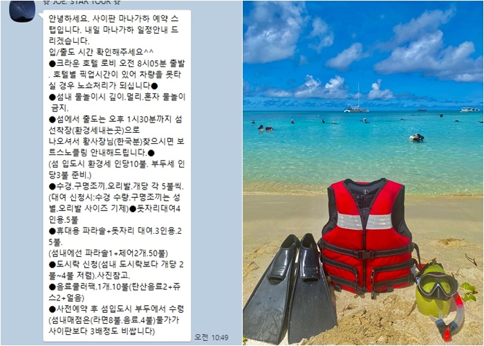 - 세심한 사전 체크: 투어 전날 리컨펌은 물론, 스노클링 장비와 도시락 등 투어 당일 필요한 준비물을 놓치지 않도록 꼼꼼히 체크해 드립니다.