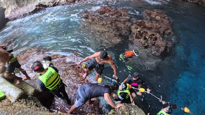 본격적인 스노클링에 앞서 그로토 입구 뒷 편에서 최고 전문가인 한국인 스텝이 진행하는 안전교육 브리핑이 진행 됩니다.
