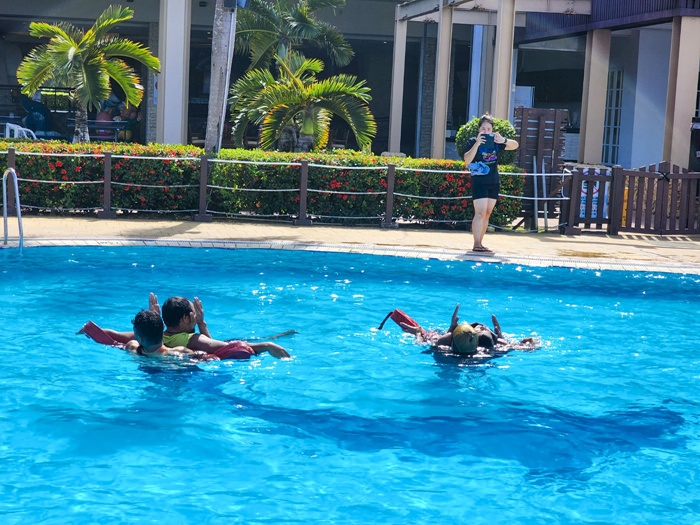이렇게 스노클 마스크를 제대로 끼는 법 부터 팀 소개 등 필수 주의사항을 유쾌하게 들으 실 수 있습니다.