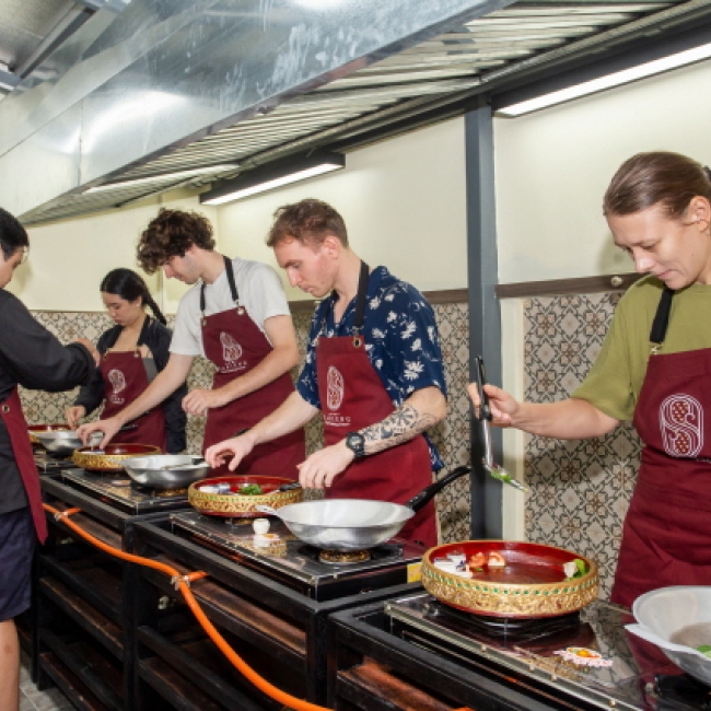 태국은 세계 6대 미식의 나라로 손꼽히는 곳입니다. 음식의 특징으로는 다양한 향신료가 첨가되어 독특한 향과 맛을 연출해낸다는것인데요. 1년 365일 더운 나라이기 때문에 더위를 이기기 위해 맵고 짜고 신맛이 강한 음식이 발달해있어요. 또한 예전부터 주변국들의 영향을 많이 받은 태국은 중국, 인도, 포르투갈, 말레이시아 그리고 불교의 영향으로 음식이 정말 다양하답니다. 이로 인해 요즘은 태국으로 여행을 오는 여행객들은 단지 여행을 오는것 뿐만 아니라 맛있는 음식을 먹기 위해 오는 사람들도 늘었으며 전문 셰프와 함께 직접 타이 음식을 만들 수 있는 쿠킹 클래스에 참여를 많이 하고 있어요. 사비엥 타이 쿠킹 스쿨은 오전/오후 클래스 모두 끄렁떠이에서 가장 큰 로컬 시장에 들러 재료에 대해 설명도 듣고 직접 구입도 해볼 수 있습니다. 깔끔하고 고급스러운 분위기의 사비엥 쿠킹 스쿨은 고객 만족도가 높은 곳이기도 합니다. 전문 셰프가 알려주고 직접 만들기 때문에 더욱 맛있는 태국 음식을 경험할 수 있어요!