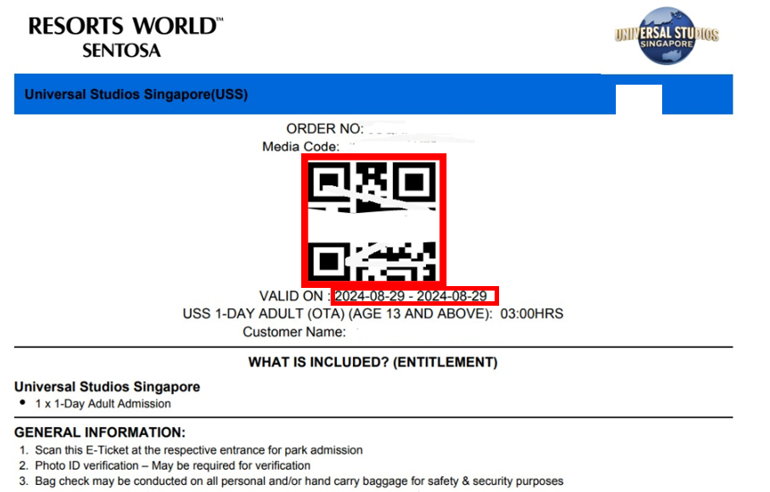 센토사 유니버셜 스튜디오 를 예약하시면 받으시게 될 E-ticket입니다.