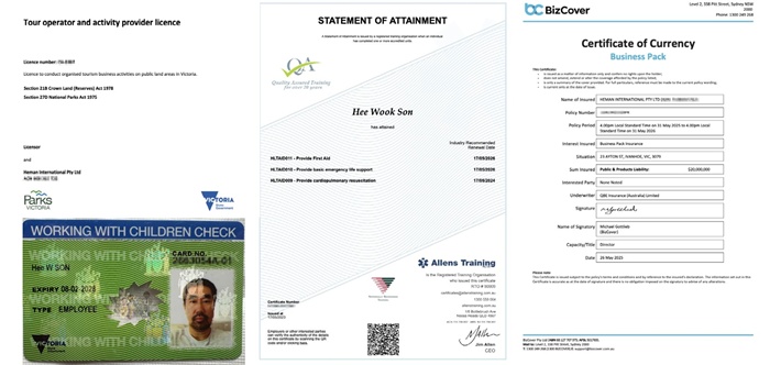 빅토리아주 투어관련 정식 라이센스, 상해보험, 응급구조 자격증까지도 준비가 된 가이드입니다.