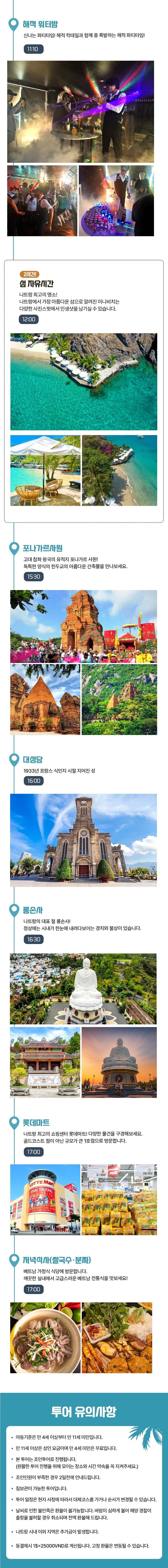 시외지역 픽업 및 드랍 추가금(편도 팀당 혼총 $10/깜란 $15/닌반베이 $15), 미니비치 음료&해양 액티비티, 옵션 마사지, 자율팁