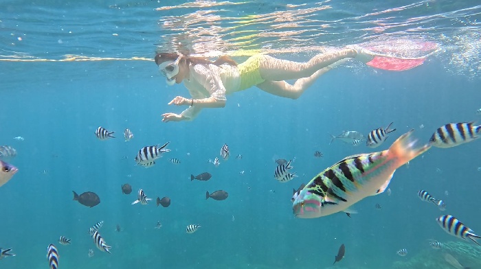 수심이 얕고 맑은 바다에서 구명조끼와 스노클 장비를 착용하고 물 위에서 편안하게 열대어와 산호초를 감상할 수 있습니다.