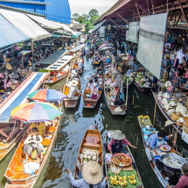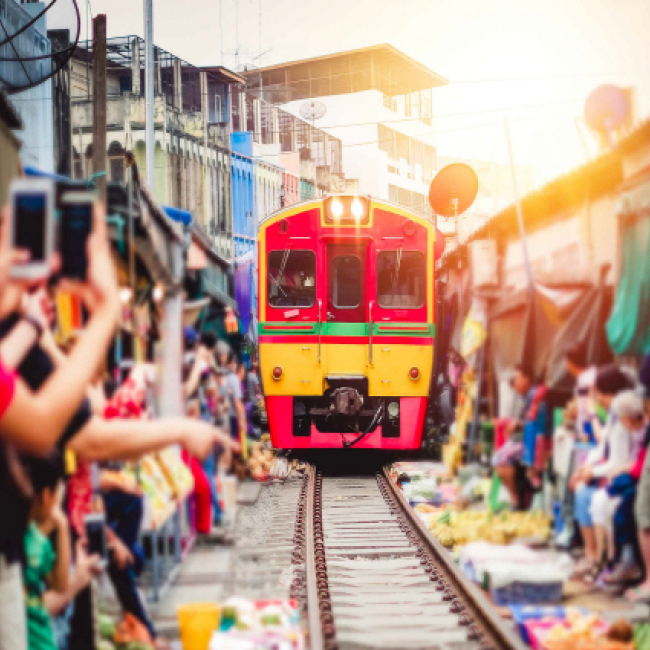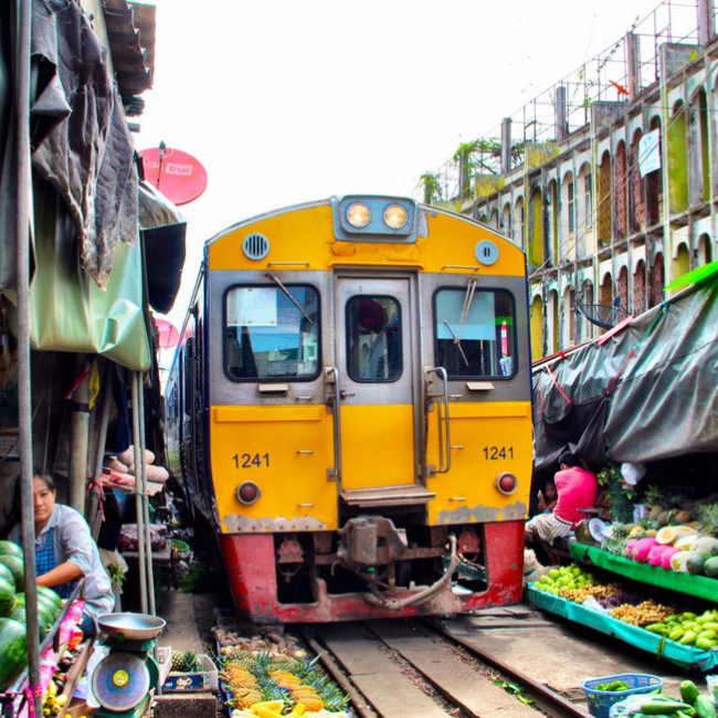 "한번은 꼭 가봐야하는 담넌사두억 수상시장과 위험한 기찻길 시장으로 떠나보세요" 방콕 근교 로컬 핫플레이스인 담넌사두억 수상시장과 위험한 기찻길 시장을 관광하는 투어에요. 첫번째로 들리는 곳은 담넌사두억 수상시장이랍니다. 롱테일 보트를 타고 좁은 운하를 지나며 물위에 지어진 여러 기념품샵과 음식점을 구경합니다. 담넌사두억 수상시장은 관광객 위주로 물건을 판매하고 있다보니 흥정은 필수에요! 두번째로 아슬아슬하게 시장길로 들어오는 기차를 보러 떠납니다. 기차 시간에 맞춰 상인들이 분주히 천막과 매대를 정리하는 진풍경이 펼쳐져요. 들어온 기차를 타고 다음역인 Lad Yai역으로 이동합니다.
