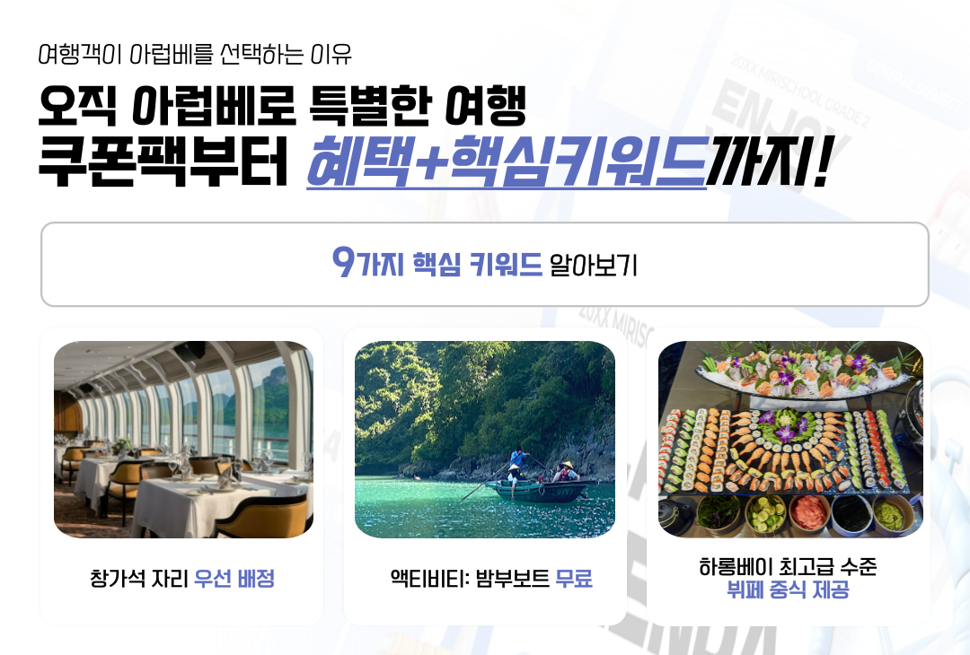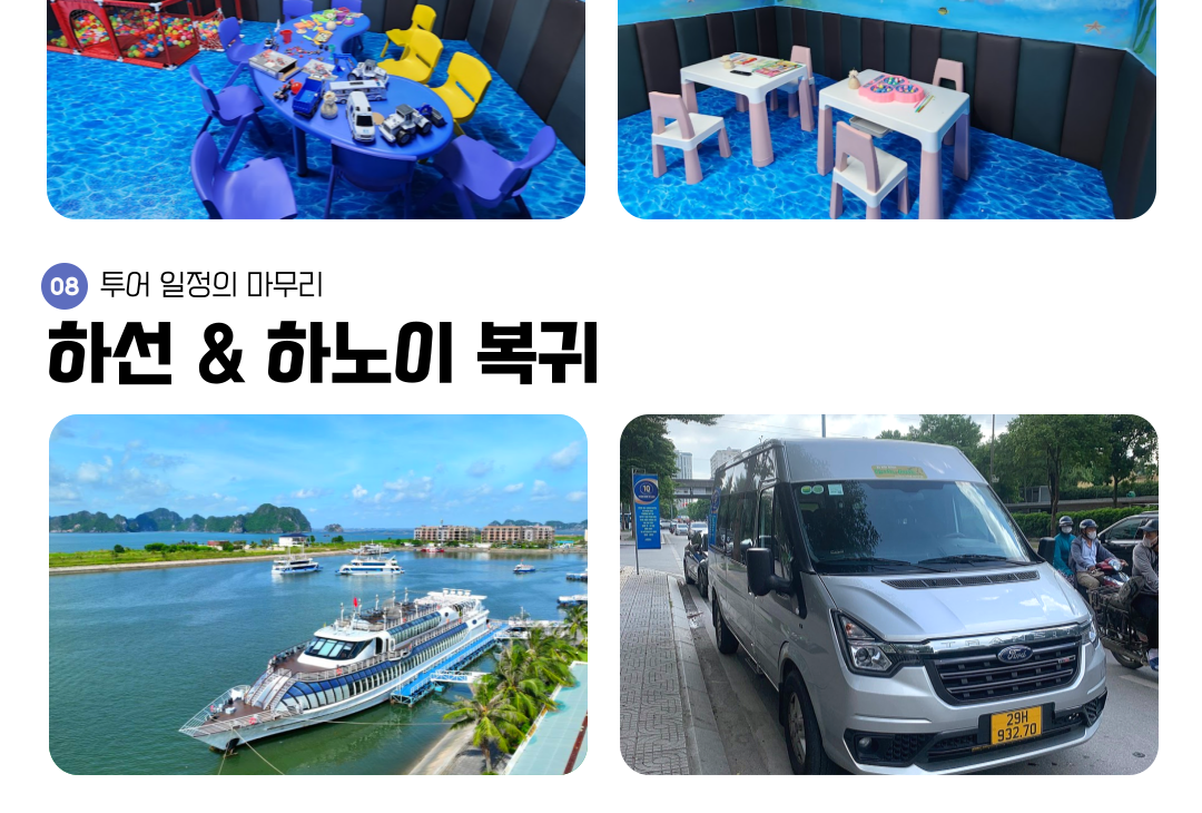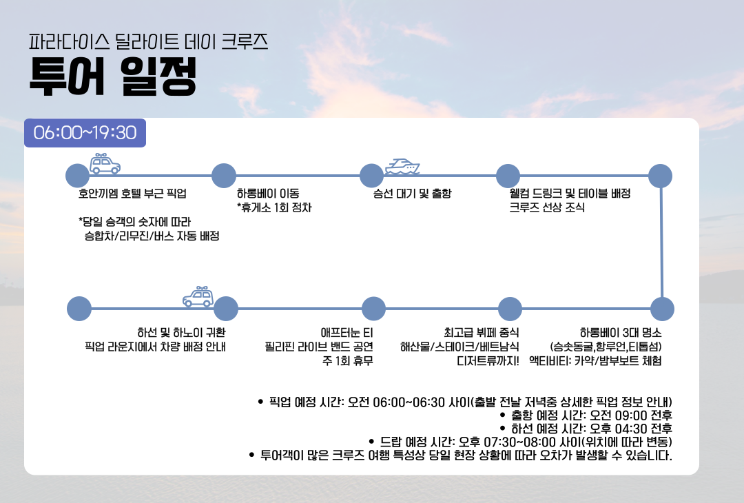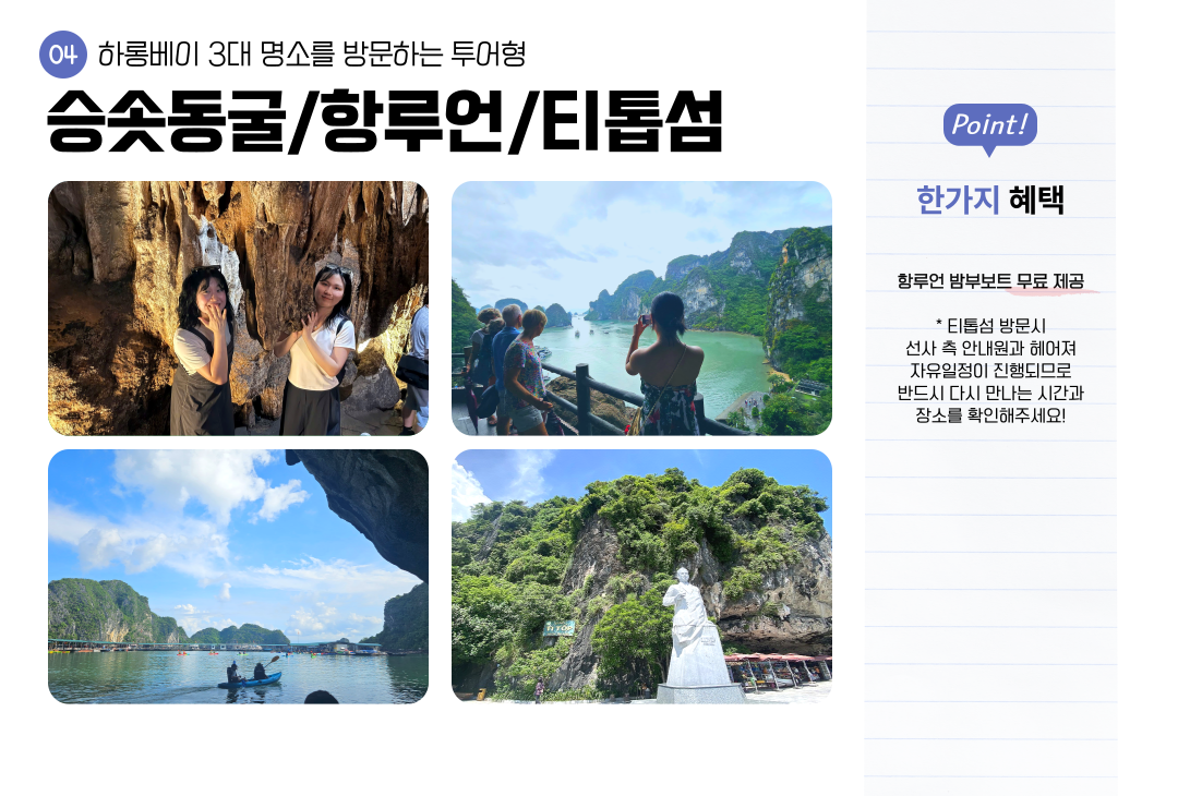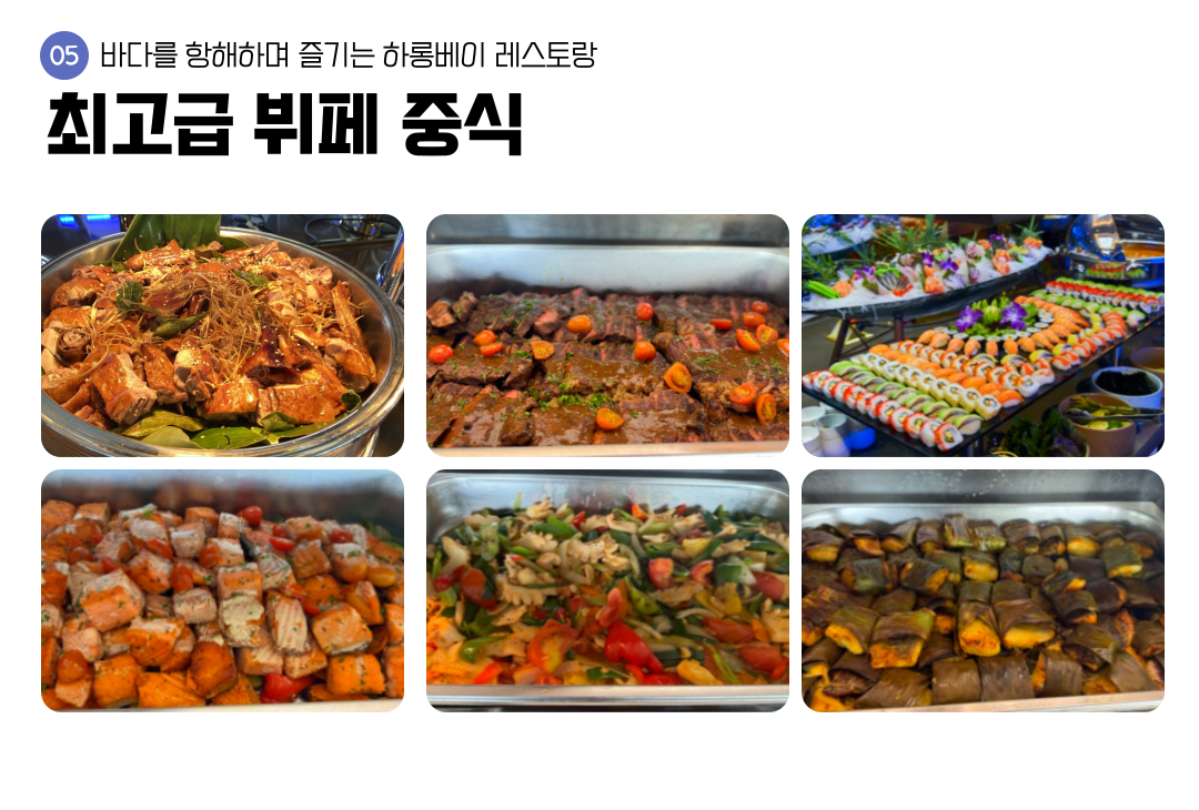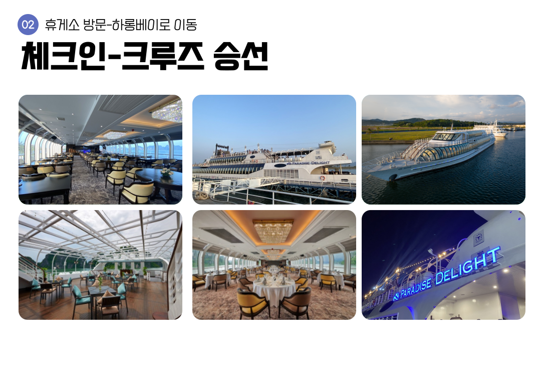 최고급 시설과 최고의 음식을 제공하며 하롱베이 3대 명소, 라이브밴드 공연으로 이루어진 일정입니다.
