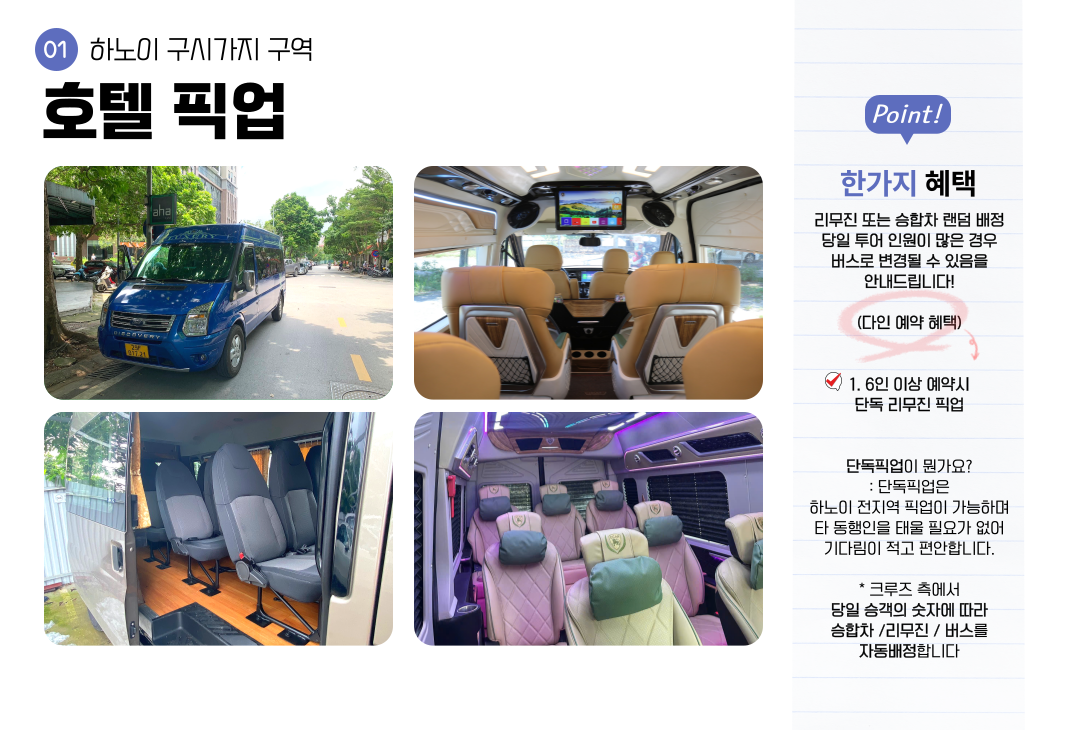 | 하노이 픽업을 포함하여 전체 취소시 | 전액 환불 / 날짜 변경 무료 |