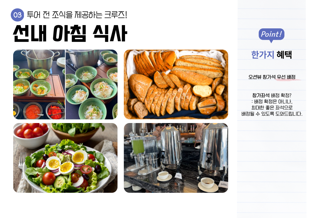 | 크루즈 일정 도중 취소 시 | 제공된 서비스(차량, 중식, 입장료) 공제 후 환불 |