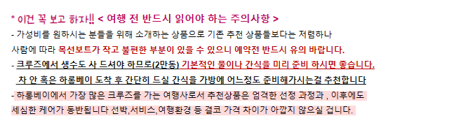 이렇게 상품에 대한 간단한 설명을 드렸구요. 저희 아이러브베트남에서는 정확한 정보 전달을 위해 당연히!!! 해당 크루즈를 직접 방문하고 있습니다. ! 주의 ! 저희처럼 상세한 설명이 없다면 직접 다녀오지 않고 판매하는 경우가 많으니 주의하세요 그럼 여행 일정을 세세히 살펴보도록 하겠습니다~ 레츠 고우!!!👉👉 * 지금부터 이하 내용들은, 당일 크루즈 현장 상황에 따라 예고 없이 변경될 수 있습니다.