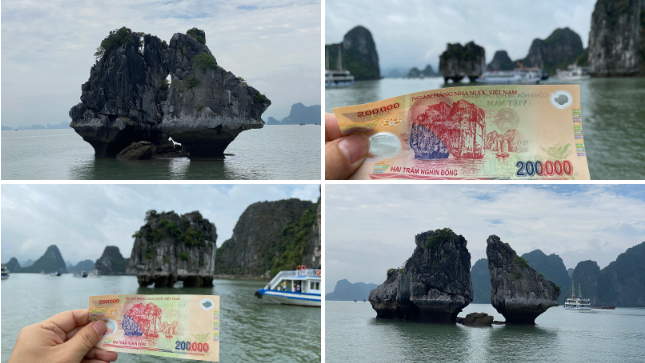 베트남 화폐 20만동에 나오는 향로 바위(예로부터 베트남을 외세로부터 지켜준다는 전설을 가진)와 키스 바위(닭 두 마리가 마주 본 형상이며, 각도에 따라 물고기로 보이기도 함)를 지납니다.