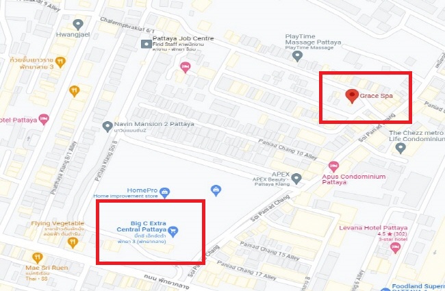 파타야 끄랑(센트럴 파타야) 빅씨 뒷편에 위치. 또는 구글지도에 [Pattaya Grace Spa] 검색 후 이동해주세요.