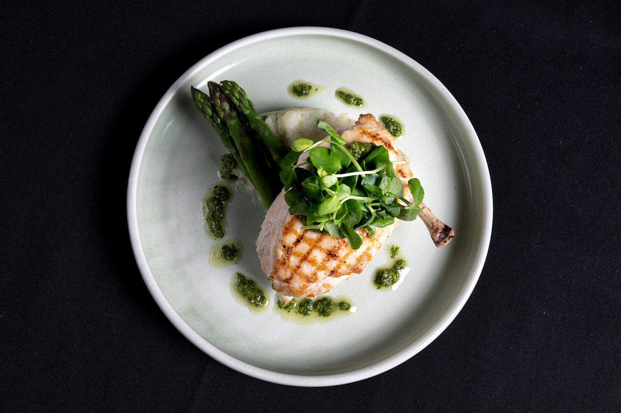 - 메인 디쉬: 셰프 특제 감자, 브로콜리니, 베이비 당근, 치미추리를 곁들인 노릇하게 구운 닭가슴살 요리