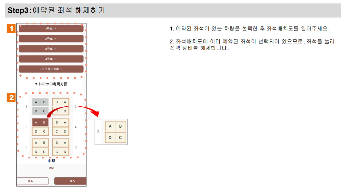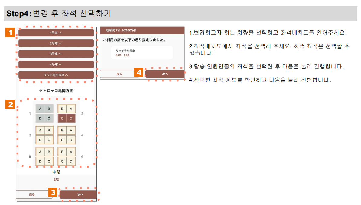 - 이용당일 지정한 승차시간까지 역 개찰구의 직원에게 시간과 좌석이 표시된 바우처 화면을 제시한 뒤 이용해 주세요. - 별도 실권교환없이 바우처 화면 제시하여 이용 가능합니다. 모바일 캡쳐본은 사용이 불가 합니다. - 만약 현장에 직원이 부재인 경우에는 예약한 좌석에 그대로 착석해 주세요. - 이용좌석은 시스템에서 랜덤으로 배정되므로 같이 예약한 건이라도 좌석이 붙어있지 않을 수 있습니다. - 좌석변경을 원하시는 경우에는 손님이 직접 바우처를 통해 좌석을 변경해 주세요. *좌석 변경 방법