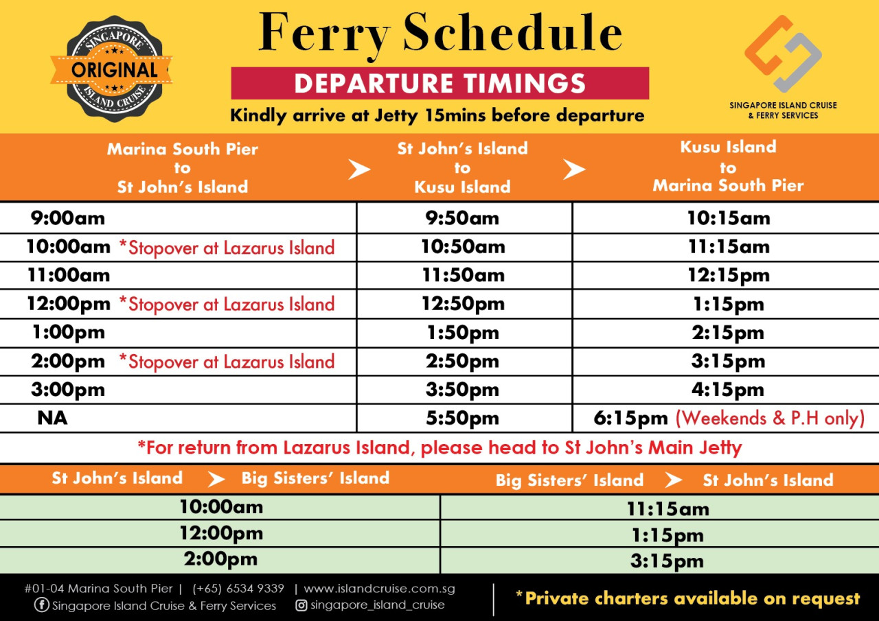 - 페리는 매일 운항합니다. https://www.islandcruise.com.sg/에서 페리 일정을 확인하세요.