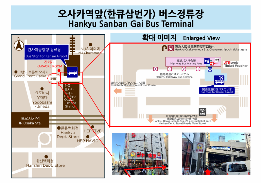 간사이공항에서 바우처의 QR코드를 발권기에 인식하여 실권으로 교환해 주세요. 발권기에서 티켓 발권시 발권용지 부족으로 티켓이 발행되지 않는 경우가 있습니다. 이때는 직원에게 문의해 주시면 발권용지 보충 후 재발행을 도와드립니다. 티켓이 확인되지 않는 경우, 직원에게 문의해 주세요. 실권으로의 교환은 간사이공항에서만 가능하므로, 시내에서 공항으로 오는 티켓을 예약한 경우에도 공항에서 교환해 주세요. 교환장소 : 간사이공항 내 지정된 8곳 제1터미널 : 북쪽 안내카운터, 남쪽 안내카운터, A발매소, B발매소, C발매소, D발매소 제2터미널 : 국내선A발매소, 국제선 안내카운터 (교환장소추가. 23.05.08부터) “오사카(우메다)→간사이공항” 노선에 한해, 간사이공항이 아닌 오사카 시내에서 실권교환 가능합니다. 신한큐호텔 1층의 남쪽현관 앞 대기소 각 노선의 시간표 및 정류장은 공식 사이트에서 확인해 주세요. 한국어사이트 바로가기