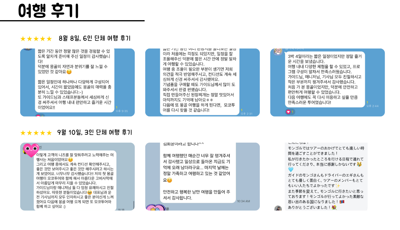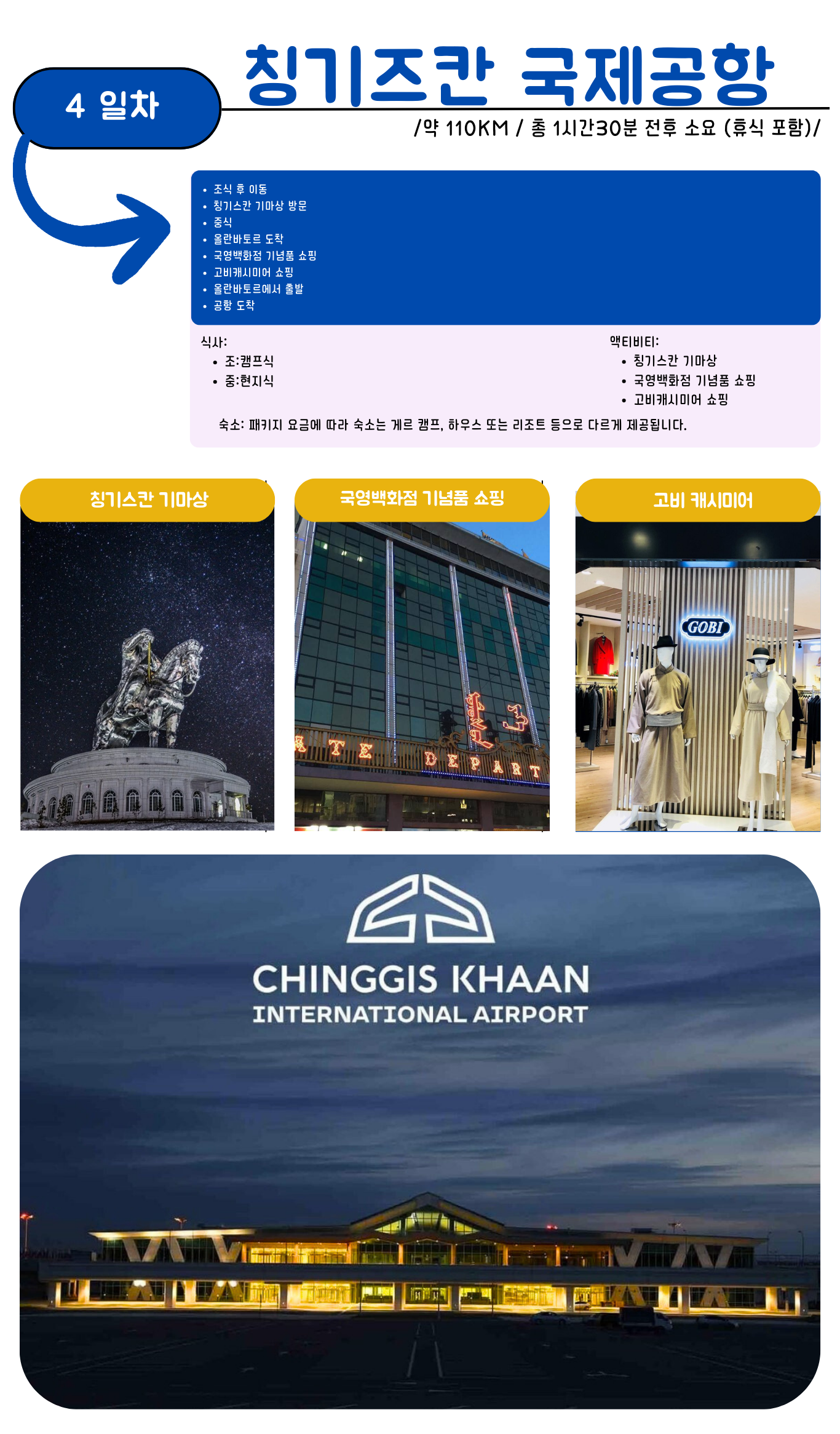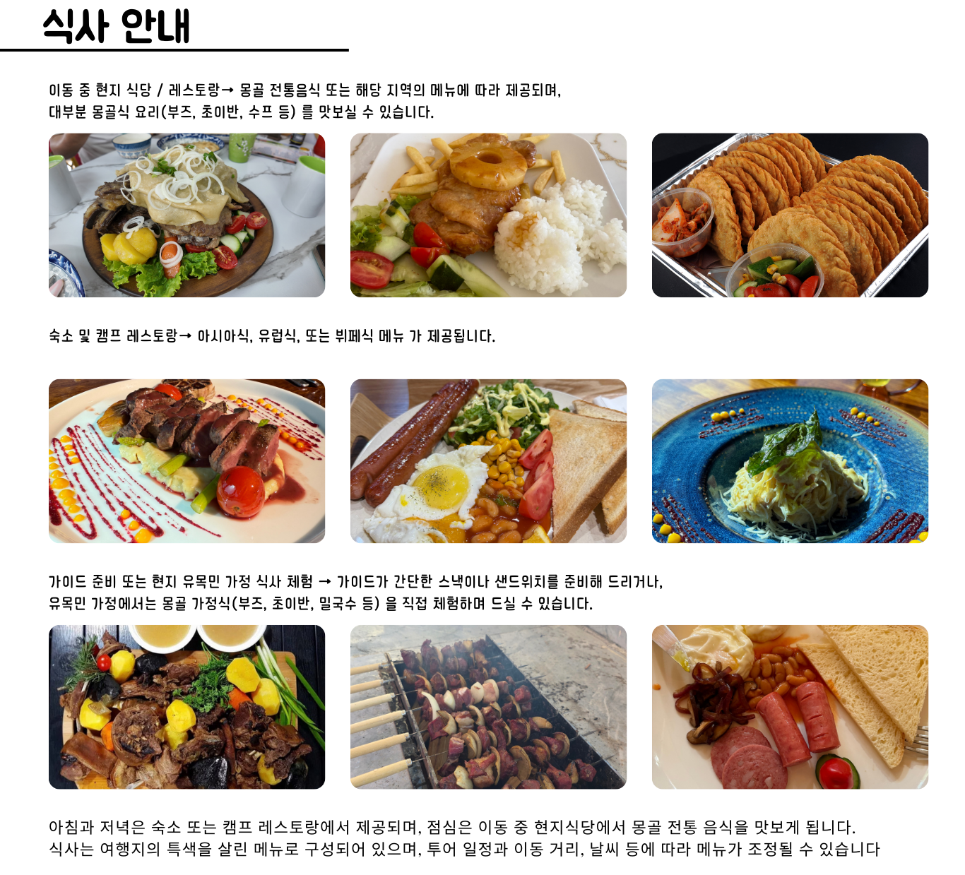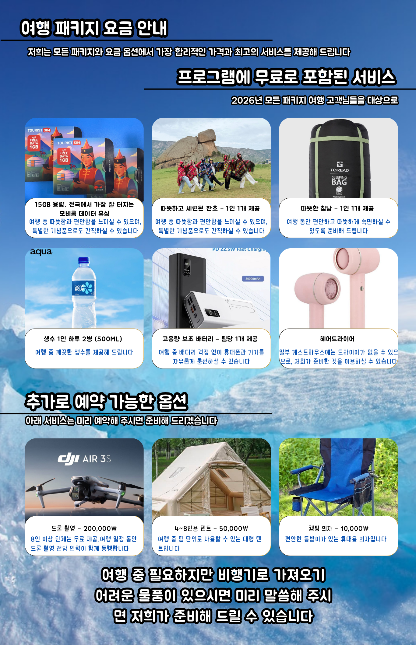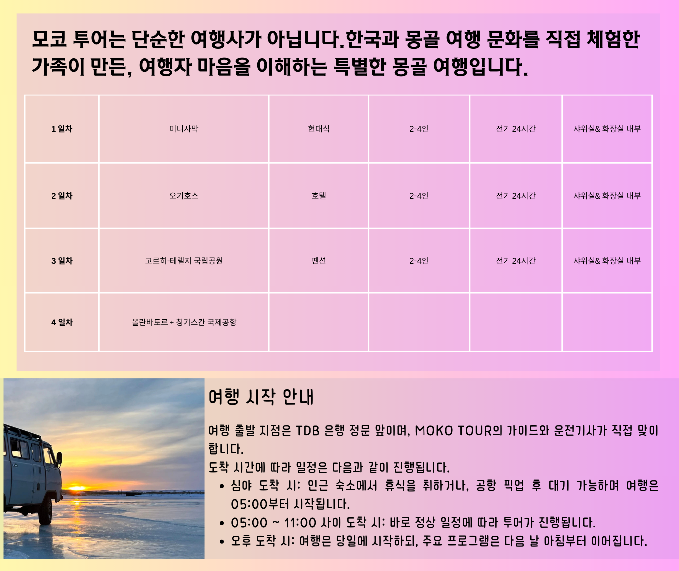 예기치 못한 차량 고장 시 여행사는 대체 차량을 즉시 지원하지만, 몽골 특성상 도착까지 시간이 소요될 수 있습니다. 이로 인한 투어 지연 또는 일정 미소화에 대한 환불은 불가합니다.