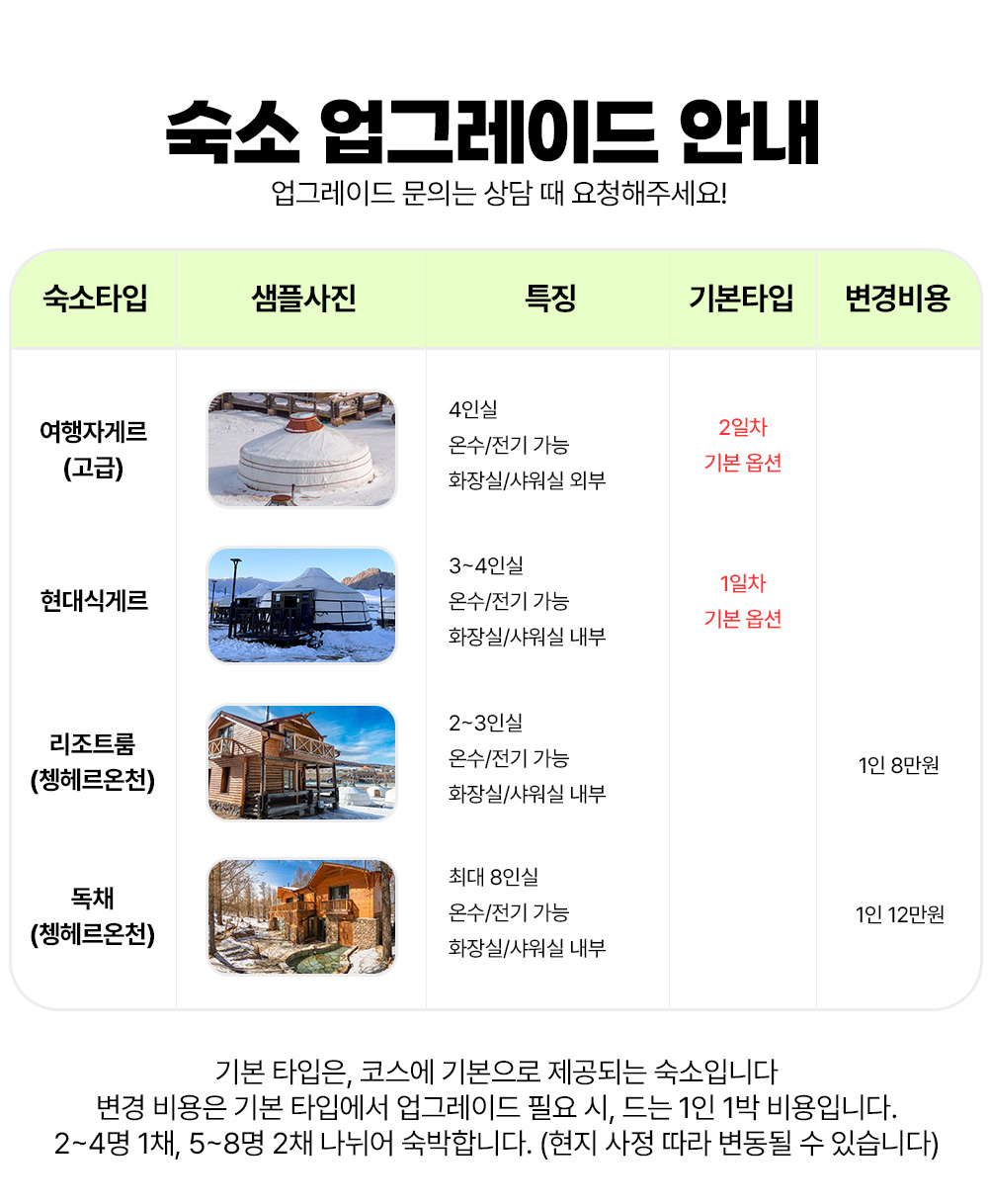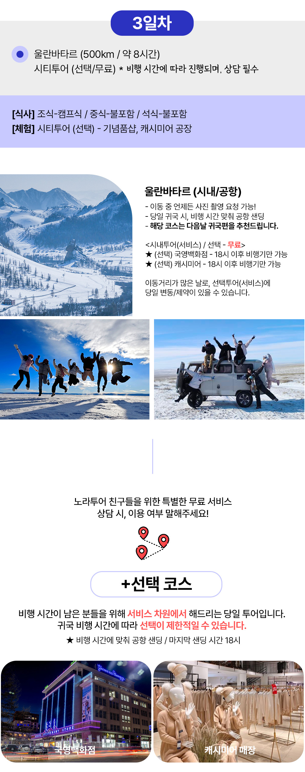 • 여행자 또는 여행사 책임 여부와 무관하게 여행 중 발생 가능한 사고·질병 등은 여행자보험으로 해결합니다. 투어 전 여행자보험 필수 가입을 권장하며, (말/낙타/ATV/말썰매/개썰매/얼음·눈썰매 등) 액티비티 특약 가입을 추천드립니다. 본 상품은 여행자보험 불포함 상품입니다.