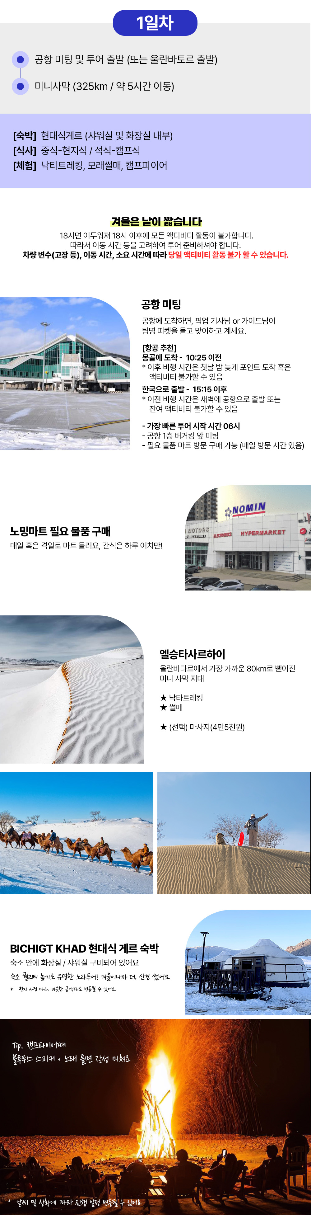 • [1day] 미니사막에서 낙타트레킹, 썰매 325km 5시간 (현대식 게르 숙박)