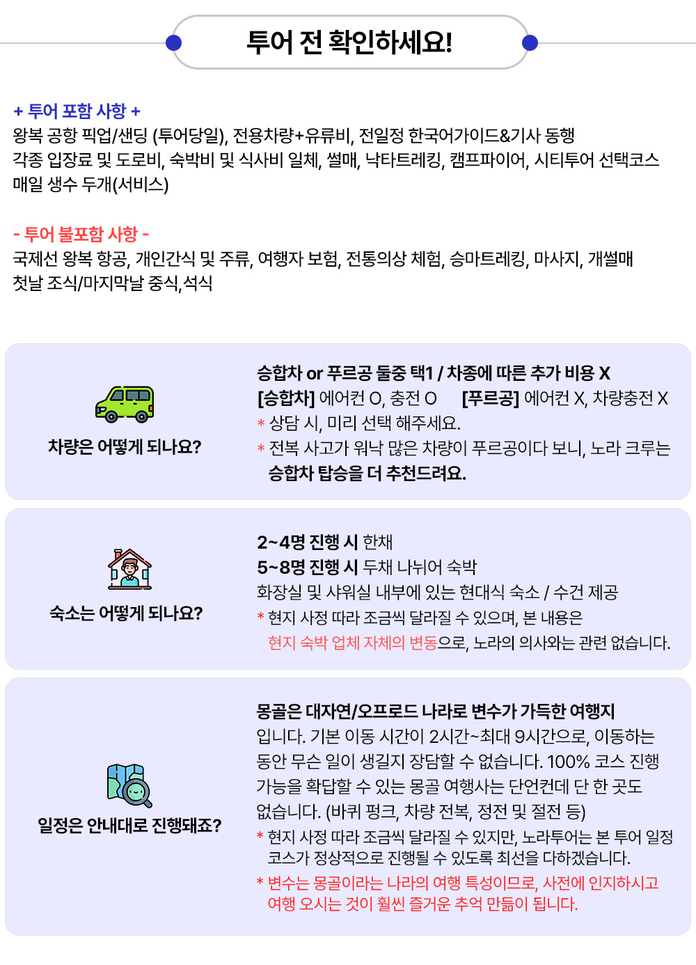 • 예기치 못한 차량 고장 발생 시 여행사는 즉시 대체 차량을 지원하나, 몽골의 장거리 특성상 도착까지 시간이 소요될 수 있습니다. 이로 인한 목적지 도착 지연 및 일정 미소화에 대한 환불은 어렵습니다.
