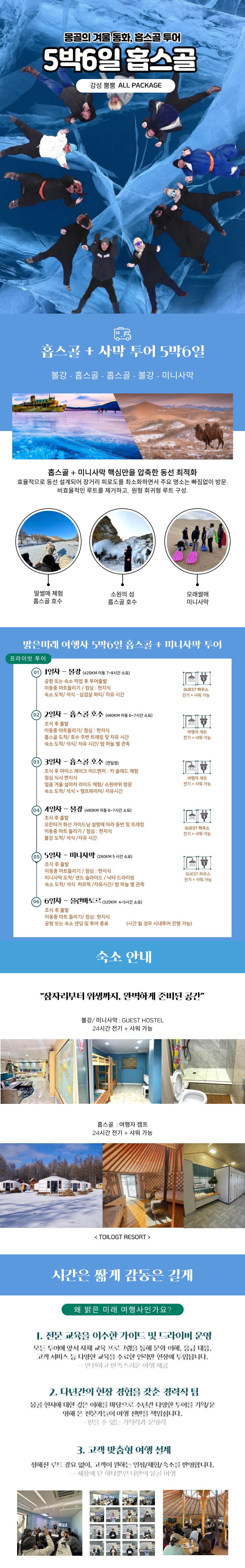 • 몽골 여행 전 국내(대한민국)에서 “여행자 보험” 가입을 권장합니다. (※ 본 상품은 여행자 보험 불포함)