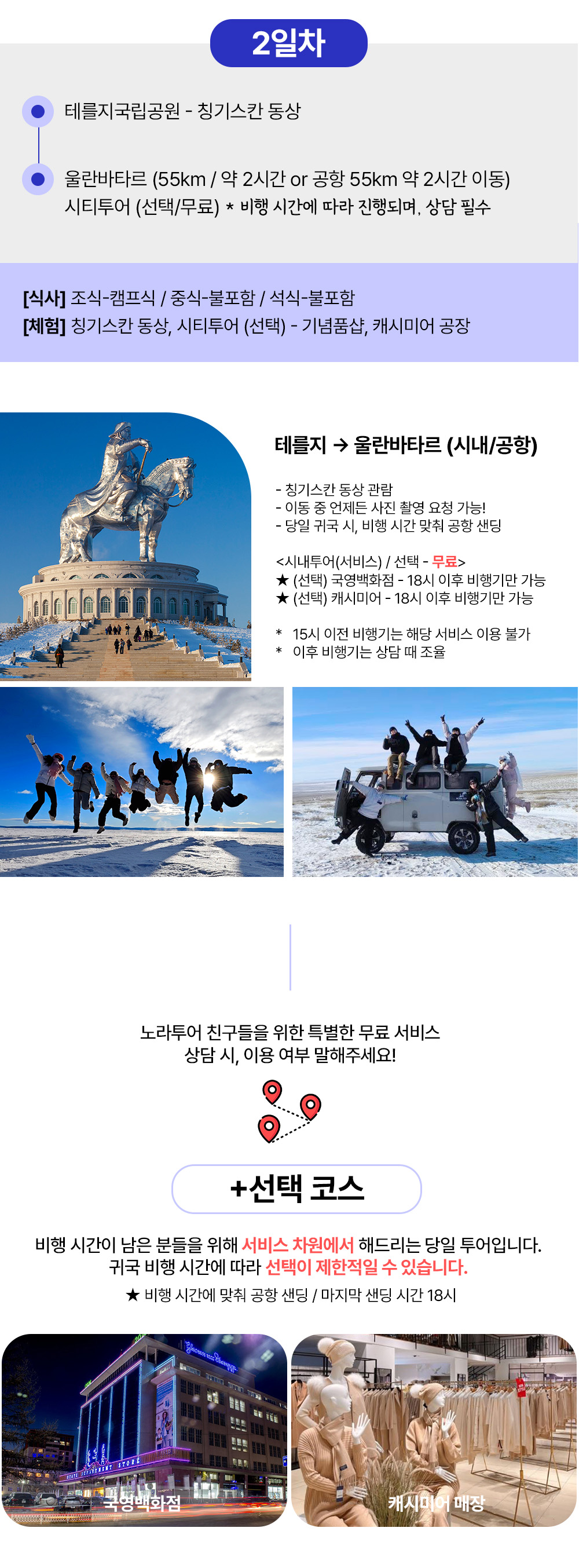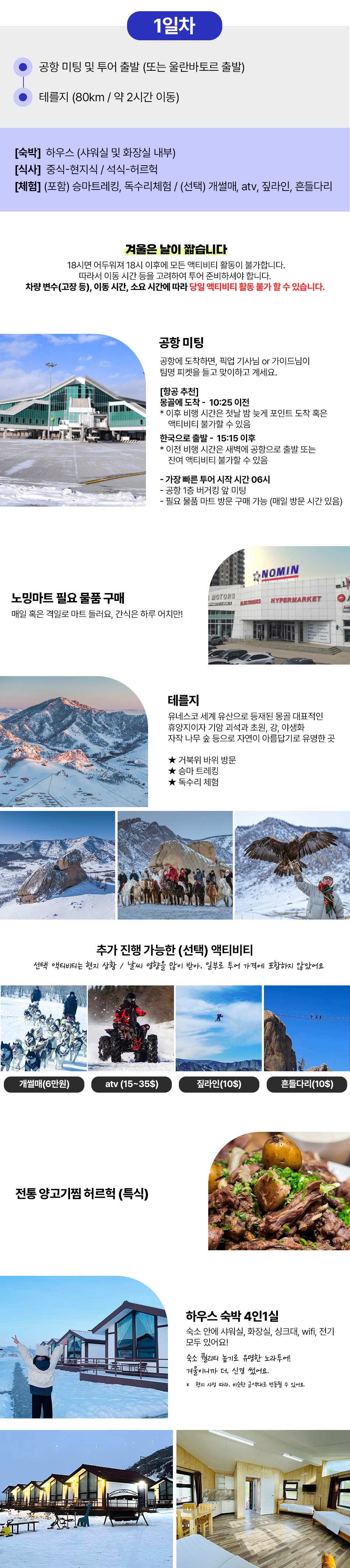 • 여행자 또는 여행사 책임 여부와 무관하게 여행 중 발생 가능한 사고·질병 등은 여행자보험으로 해결합니다. 투어 전 여행자보험 필수 가입을 권장하며, (말/낙타/ATV/말썰매/개썰매/얼음·눈썰매 등) 액티비티 특약 가입을 추천드립니다. 본 상품은 여행자보험 불포함 상품입니다.