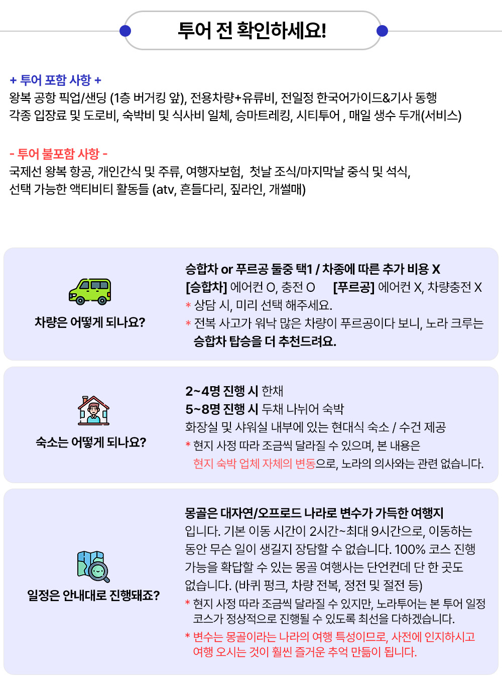 • 예기치 못한 차량 고장 발생 시 여행사는 즉시 대체 차량을 지원하나, 몽골의 장거리 특성상 도착까지 시간이 소요될 수 있습니다. 이로 인한 목적지 도착 지연 및 일정 미소화에 대한 환불은 어렵습니다.