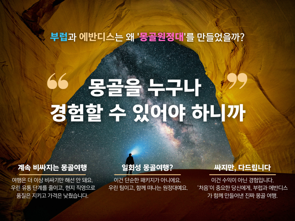 몽골은 날씨 변화와 예기치 못한 상황이 자주 발생하는 지역이기 때문에, 여행자 보험 가입을 강력히 권장드립니다. 안전한 여행을 위해 꼭 가입해 주세요. 부럽트래블을 통해 예약하신 고객님께는 제휴 보험사 20% 할인쿠폰을 출발 2주 전에 제공해 드립니다.