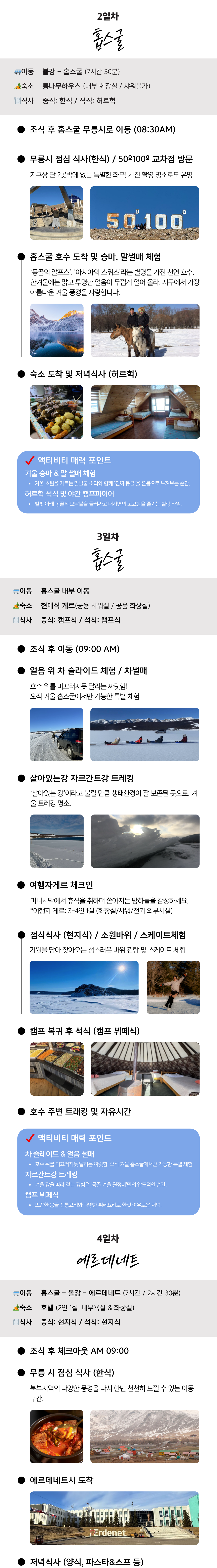 • 어기호수는 12월경부터 완전히 얼기 시작하며, 출발 일정에 따라 가능한 액티비티가 달라집니다. 고객님의 안전을 최우선으로 고려하여, 가장 적합한 겨울 액티비티를 현지 상황에 맞게 진행합니다.