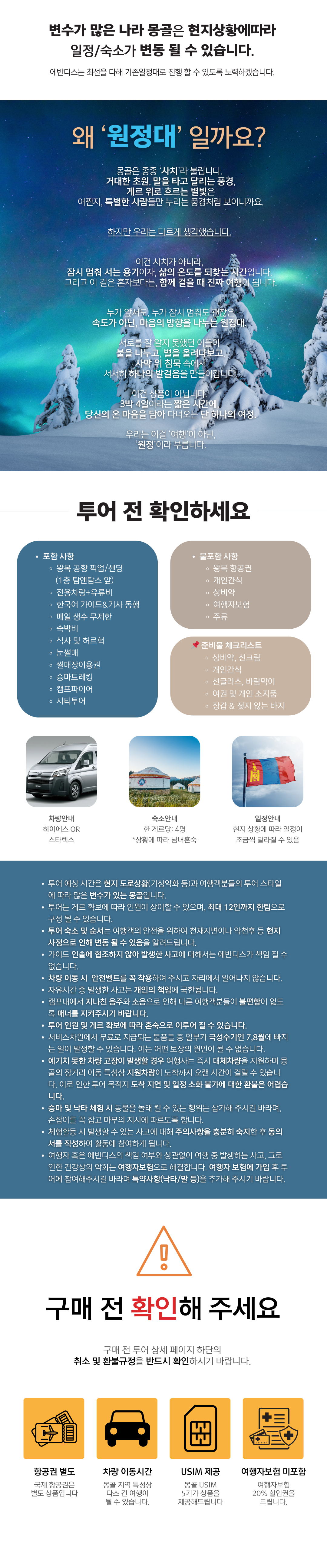 • 몽골 현지 날씨나 교통 사정에 따라 일정이 일부 변동될 수 있습니다. 변동이 필요한 경우, 베테랑 몽골 현지 가이드가 상황에 맞춰 가장 좋은 방향으로 일정을 조율해 드립니다.