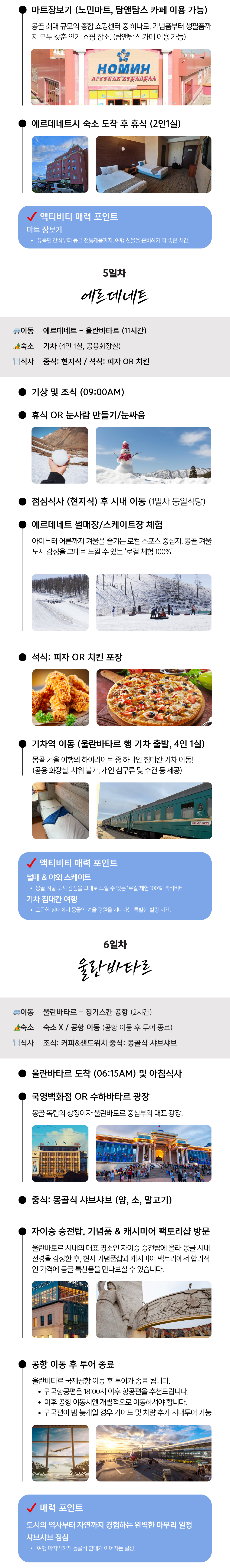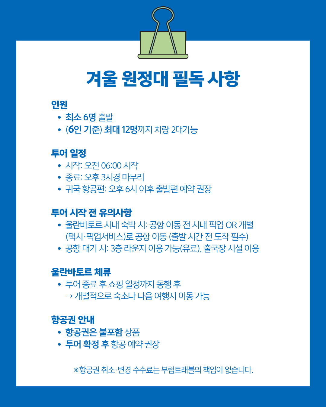 • 겨울의 몽골을 충분히 느낄 수 있도록 테를지 코스가 제외되고, 대신 청헤르온천 코스가 포함됩니다. 또한 계절에 따라 액티비티가 변경되며, 겨울에만 즐길 수 있는 특별한 체험이 준비됩니다.