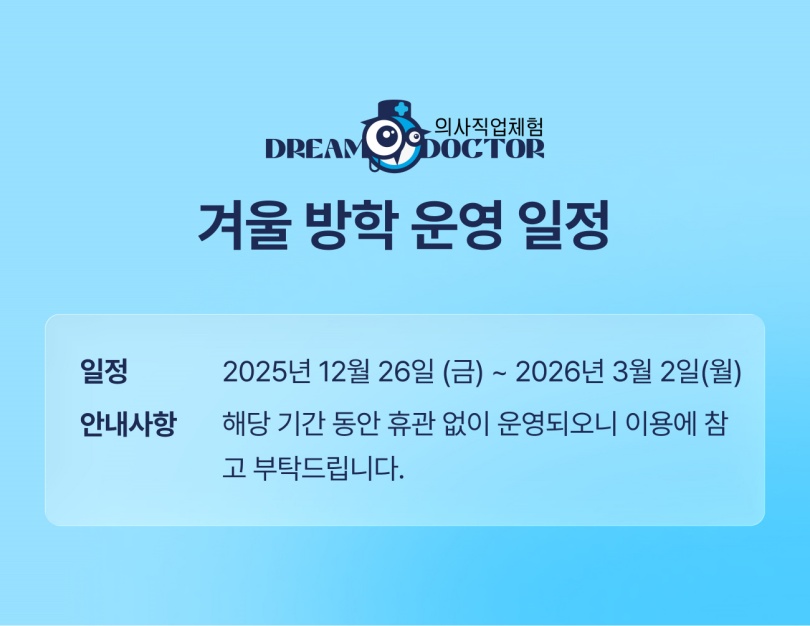 겨울 방학 시즌 이용 안내 : 2025년 12월 26일(금) ~ 2026년 3월 2일(월)까지 휴관 없이 운영합니다.