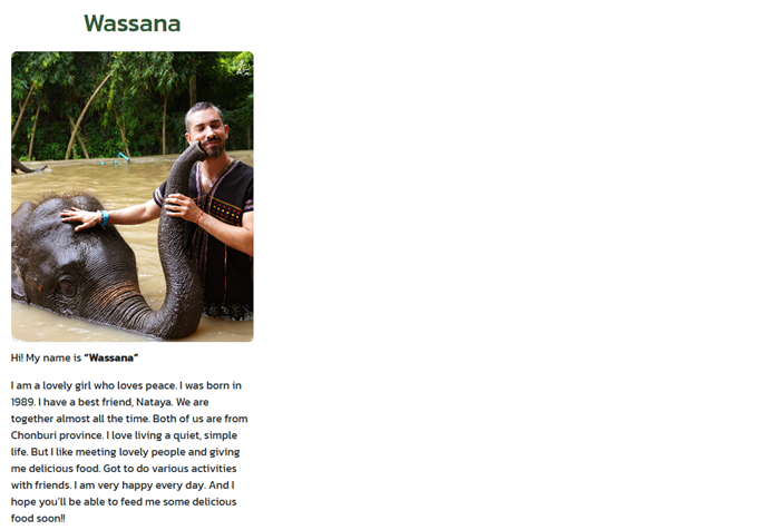1995년 태어난 여자 숙녀 코끼리입니다. 장난기 많은 성격과 귀여운 앞머리가 매력적인 코끼리로 촌부리 출신입니다.