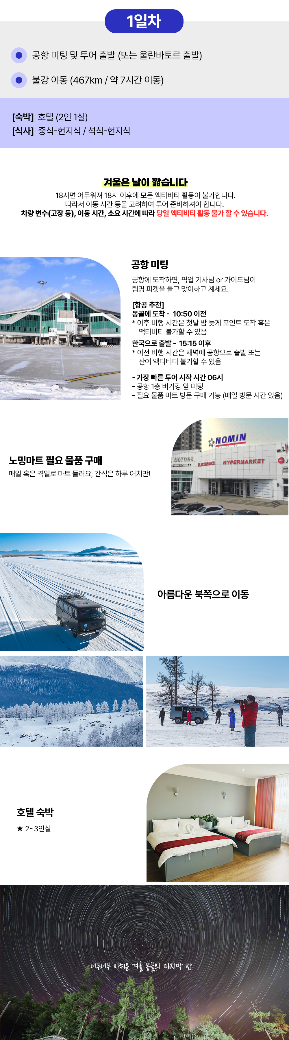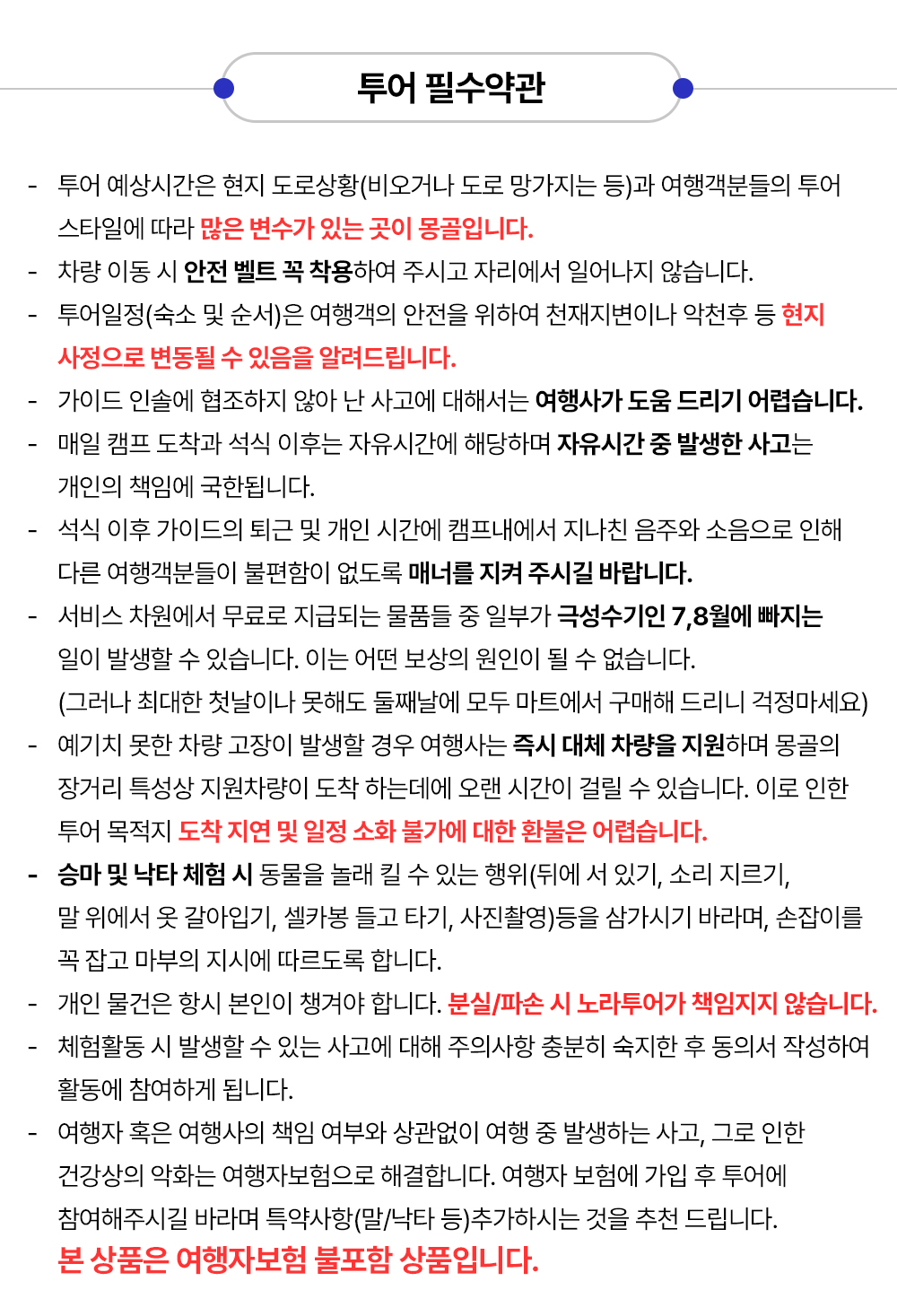 • 여행자 또는 여행사 책임 여부와 무관하게 여행 중 발생 가능한 사고·질병 등은 여행자보험으로 해결합니다. 투어 전 여행자보험 필수 가입을 권장하며, (말/낙타/ATV/말썰매/개썰매/얼음·눈썰매 등) 액티비티 특약 가입을 추천드립니다. 본 상품은 여행자보험 불포함 상품입니다.