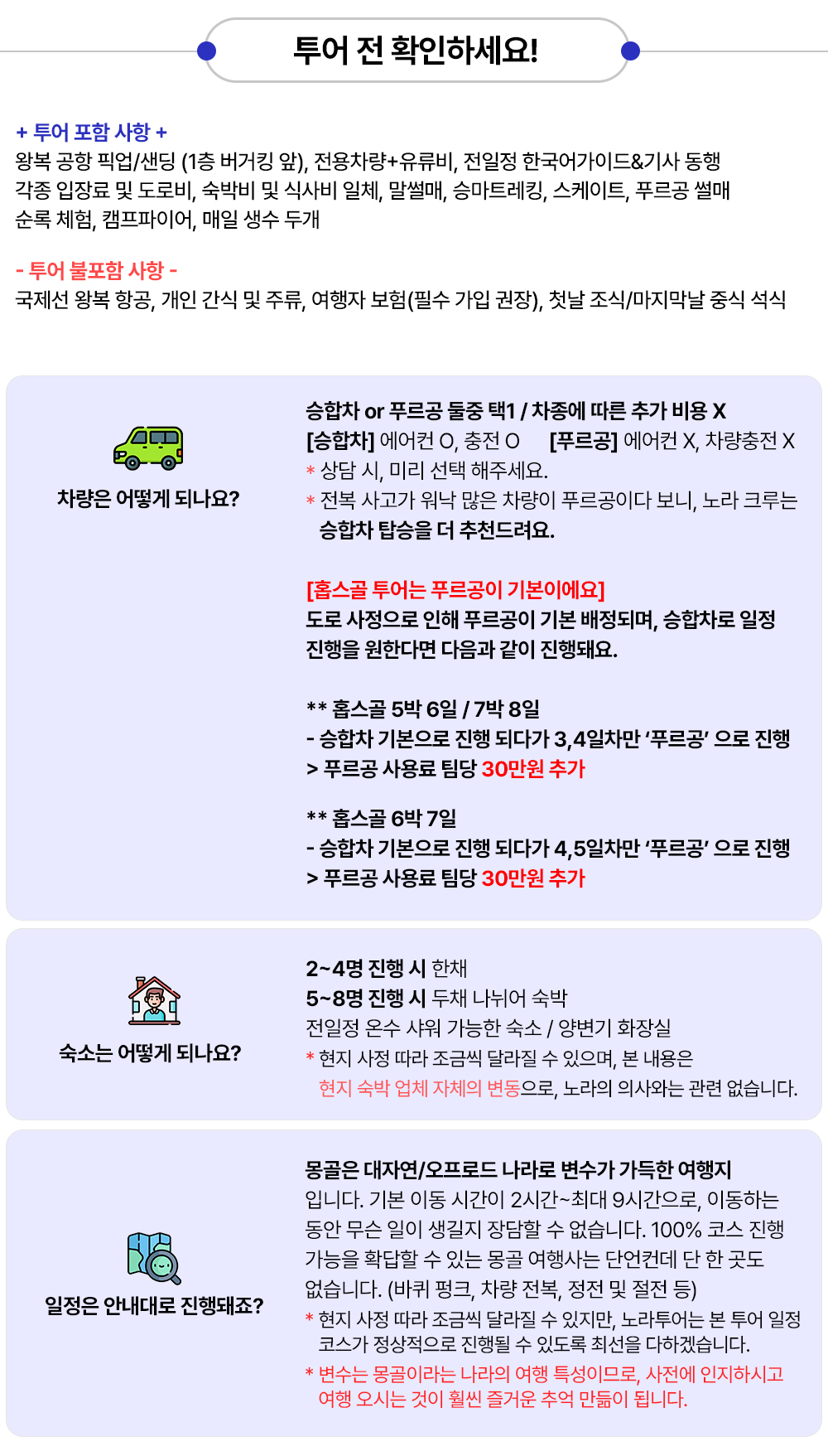 • 예기치 못한 차량 고장 발생 시 여행사는 즉시 대체 차량을 지원하나, 몽골의 장거리 특성상 도착까지 시간이 소요될 수 있습니다. 이로 인한 목적지 도착 지연 및 일정 미소화에 대한 환불은 어렵습니다.