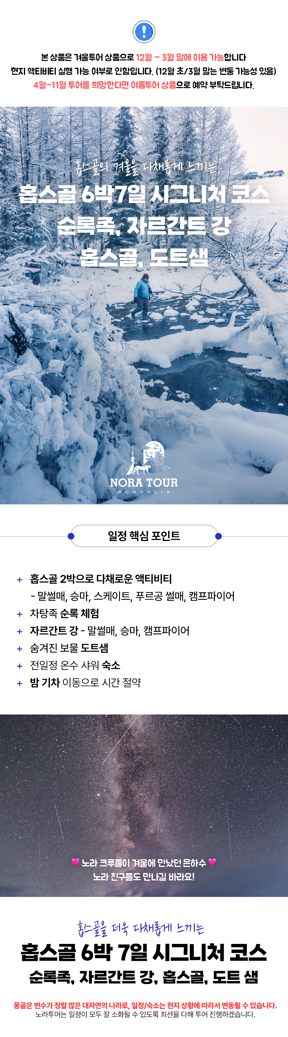 [겨울몽골]6박7일 시그니처 /홉스골연박,순록족,자르간트강,도트샘