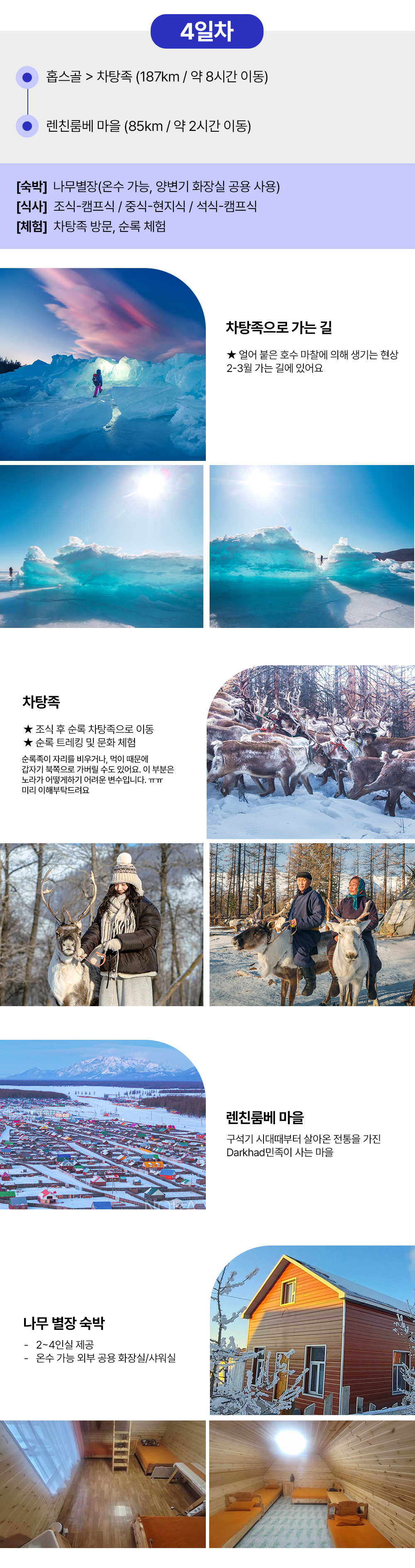 • [4day] 차탕족 순록 체험 / 187km 8시간 → 렌친룸베 마을 / 85km 2시간 (나무 별장)