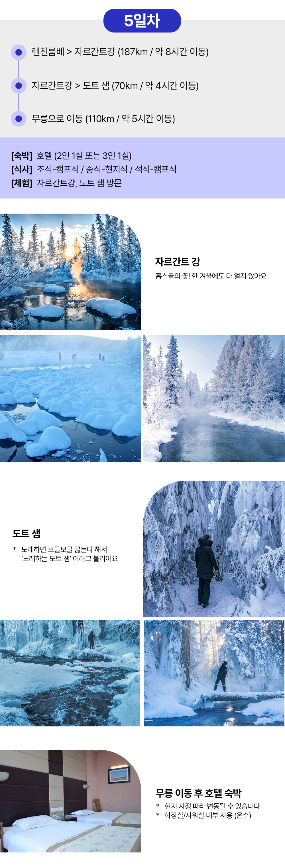 • [5day] 겨울의 꽃 자르간트 강 → 숨겨진 보물 도트 샘 / 70km 4시간 → 무릉호텔 / 110km 5시간 (호텔)