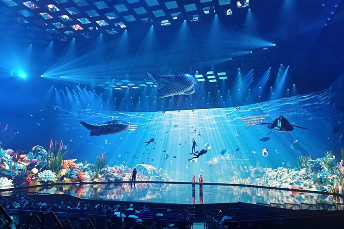 무대를 자유자재로 움직이는 거대한 로봇 팔, 밤하늘의 별처럼 무대를 수놓는 드론 군무, 그리고 극장 전체를 감싸는 360도 LED 스크린이 만들어내는 시각적 스펙터클은 "입이 떡 벌어진다", "압도적이다"라는 평이 지배적입니다.