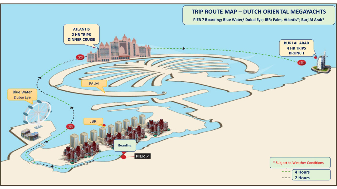 도우 크루즈에 탑승하여 아인 두바이, 주메이라 비치 레지던스, 마리나, 블루워터, 더 팜 등 두바이의 멋진 스카이라인과 야경을 감상하고, 크루즈 내 라이브 공연과 인터내셔널 뷔페, 음료 등을 즐기실 수 있습니다.