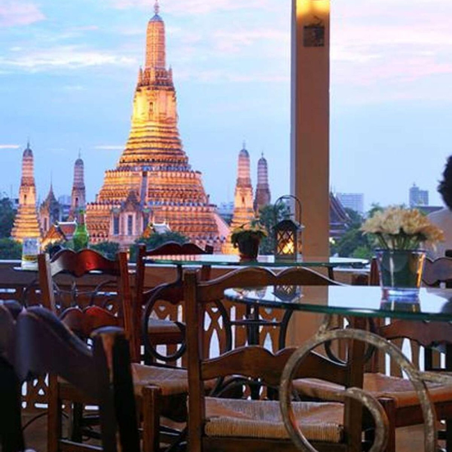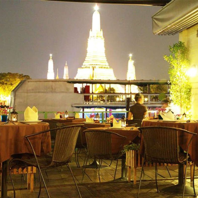 왓 아룬과 차오프라야 강이 내려다보이며, 매일 일품요리, 점심 및 저녁 식사를 제공합니다.