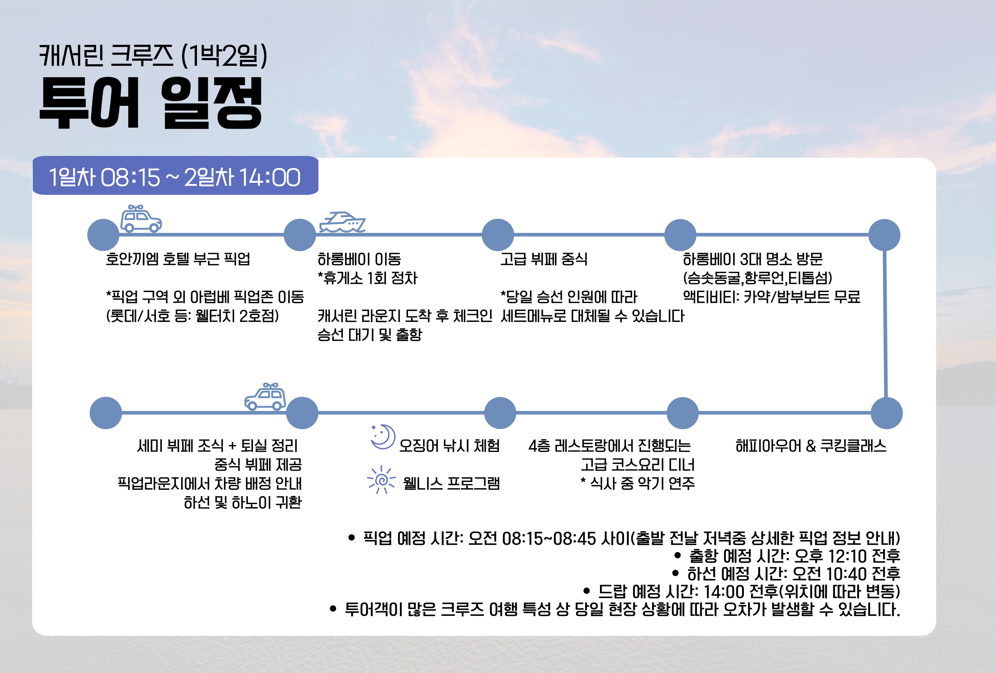 | 크루즈 일정 도중 취소 시 | 제공된 서비스(차량, 중식, 입장료) 공제 후 환불 |